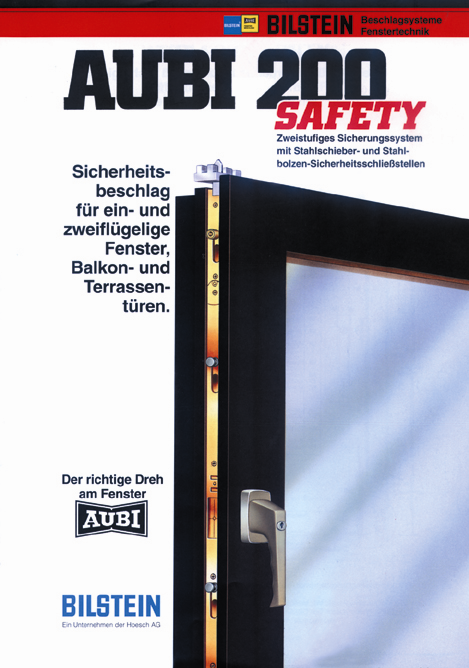 Ende der 80er Jahre rückte das Thema Einbruchhemmung mehr ins Blickfeld. Die Anforderungen an das Fenster wurden höher, und die Hersteller reagierten mit entsprechenden Produkten wie dem Pilzkopf, der für eine feste Verbindung zwischen Flügel und Rahmen sorgt. Beschläge wie beispielsweise der „Aubi 200 Safety“ erschwerten damals Einbrechern den Einstieg durch ein- oder zweiflügelige Fenster im Erdgeschoss oder Balkon- und Terrassentüren deutlich.