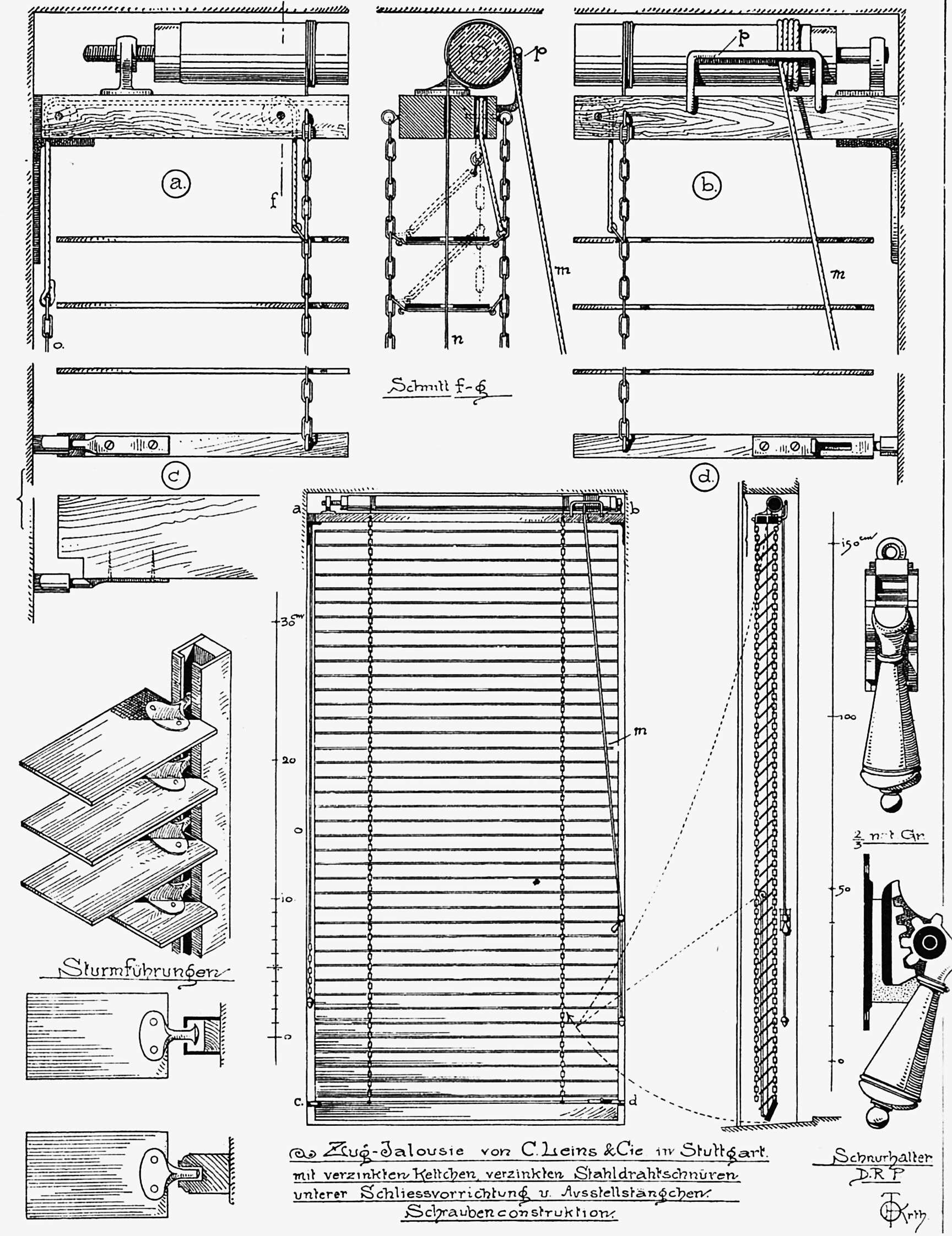 Dass diese Entwicklung von den Schreinerbetrieben heftig beklagt wurde, sei nur am Rande erwähnt. Da die durch strapazierfähige Leinenstoffe, Leinengurte, Stahlbänder, Stahldrahtschnüre oder Stahlplättchen miteinander verbundenen, speziell profilierten Holzstäbchen über eine Rolle aufgezogen werden, ergab sich die Notwendigkeit, nicht nur die Zugvorrichtungen in die Fensterkonstruktionen zu integrieren, sondern vor allem auch, die Rolle versteckt hinter dem Sturz unterzubringen.