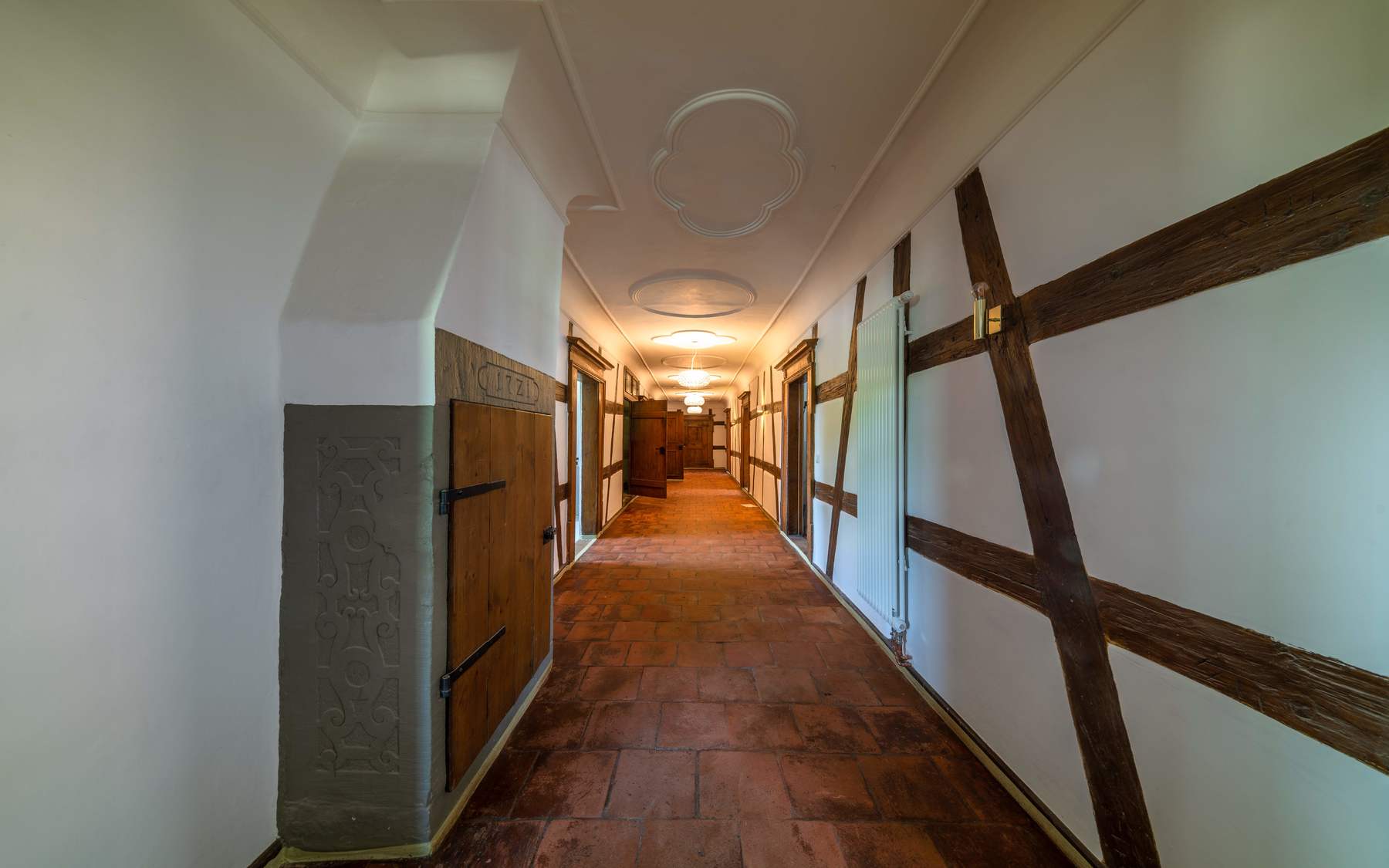 Dieser ursprüngliche Zweck des Gebäudes lässt sich an der Aufteilung der Räume heute noch gut erkennen. Wer das Haus durch den vom überdachten Kelleraufgang etwas versteckten Haupteingang betritt, der meint er blicke zurück in die Zeit, als noch die Klosterknechte hier ein und aus gingen. Der lange Gang mit Fachwerkwänden, historischem Terrakottaboden, stuckverzierten Decken und den besonders gestalteten Zargen der Zimmertüren imponiert. Gleich links vor dem ersten Raum, der vermutlich aufgrund der einzigen Heizmöglichkeit im Haus dem Verwalter des Hofes zugeteilt war, deutet die Inschrift am Ofen auf das Baujahr 1721 hin. Über den Gang hinweg erstrecken sich links und rechts sechs gleich große Wohnräume, das Badezimmer, ein Aufgang zum Dachgeschoss und eine Abstellkammer. Die Tür am Ende des Ganges führt zum großzügigen Wohnzimmer mit Essbereich.