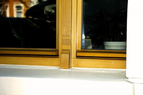 Fußstück bzw. Verzierungselement, das am unteren Ende der Schlagleiste oder des Pfostens eines Fensters sitzt.