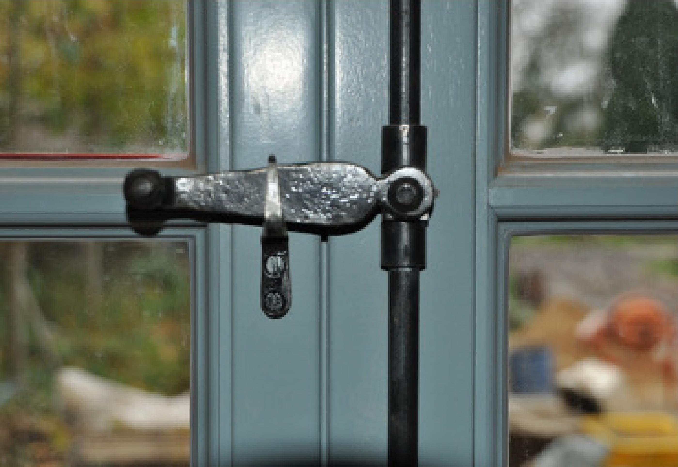 Drehstangenverschluss der mit Hülsen je nach Ausführung auf der inneren Schlagleiste oder dirket auf dem Flügel befestigt wird. Die Stange ist in der Mitte mit einem Ruder verbunden, das in einen auf dem anderen Flügel angebrachten Schließhaken greift. Die Stangenenden sind hakenförmig ausgeschmiedet und legen sich beim Drehen der Stange in eiserne Schließkloben, die am Kämpfer bzw. der oberen und unteren Seite des Blendrahmenholzes befestigt werden.
