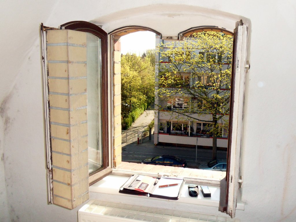 Im nächsten Beispiel sind noch alte einfachverglaste Fenster vorhanden und das Giebelfenster ist ein zweiter Rettungsweg mit einer historischen, kreativen Lösung.