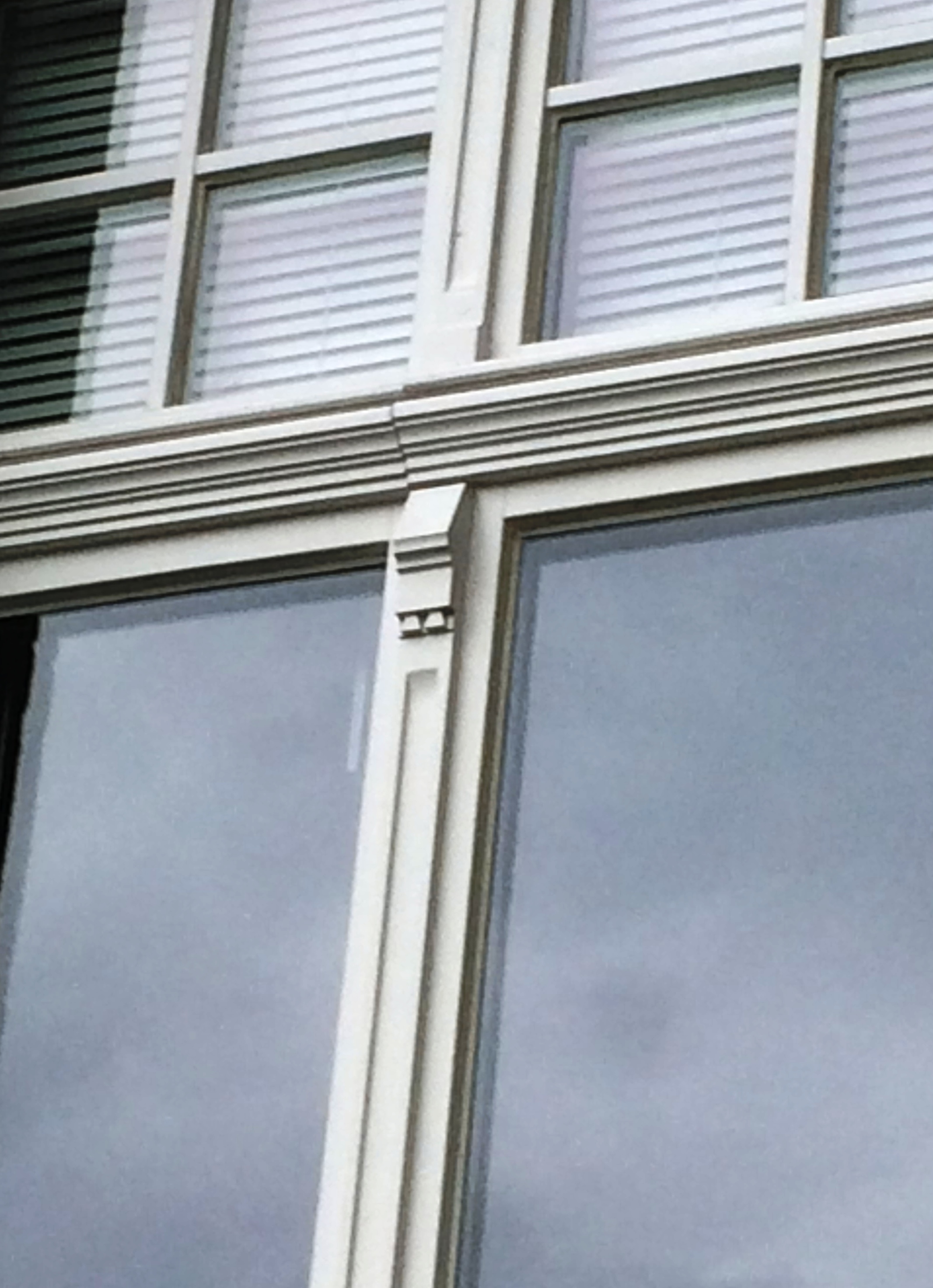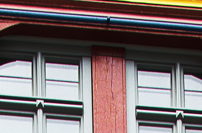Erst bei weiterer Vergrößerung zu erkennen: Der zwischen den Fenstern eingesetzte Balken ist nur eine Attrappe und nicht konstruktiv. Tatsächlich handelt bei dieser Anlage um ein zweiflügeliges Stulpfenster, bei dem die Schlagleiste eine extreme Sonderbreite hat und optisch wie ein Fachwerkbalken wirkt. Die Teilung innerhalb der beiden Fenster ist ebenfalls nicht konstruktiv, sondern nur aufgesetzt (siehe Schnittzeichnung unten). Das Gesamtergebnis ist sehr gut und als Rettungsfenster selbst von Fachleuten nicht zu erkennen.