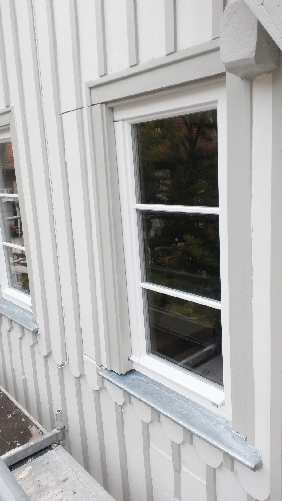 Jetzt in voller Breite: Der linke Stulpflügel ist von außen unsichtbar hinter mit einer zu öffnenden Verbretterung verdeckt. Der Bedarfsflügel ist mit einer Holzfüllung anstelle von einer Verglasung verschlossen, damit man von innen bei geschlossener Verbretterung nicht auf das Holz schauen muss. Sehr gute und durchdachte Lösung als Ergebnis gemeinsamer Bestrebung, ein möglichst unauffälliges Fluchtfenster in die Fassade zu integrieren.