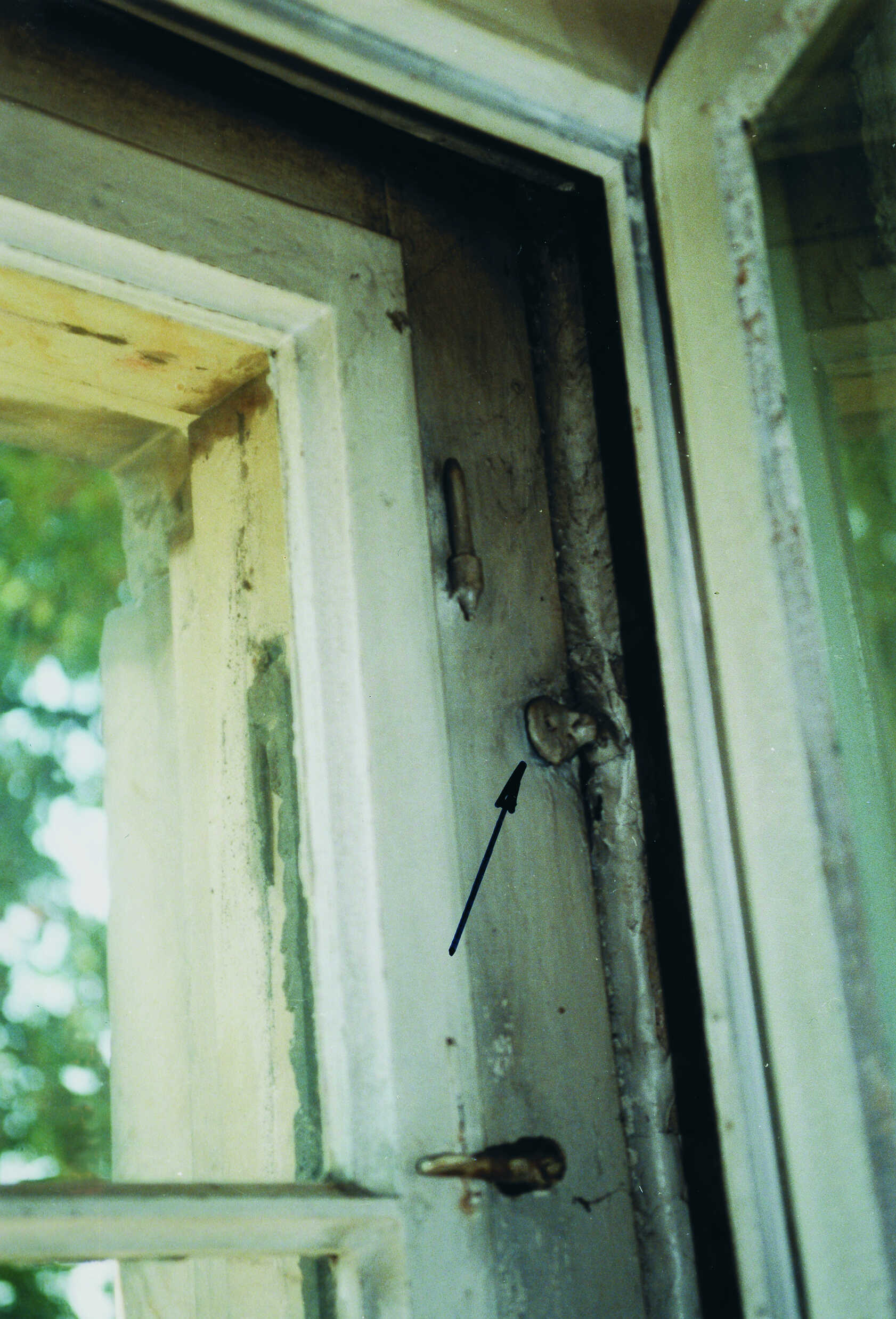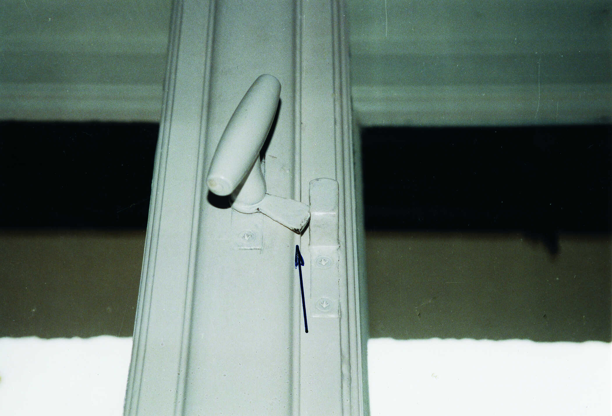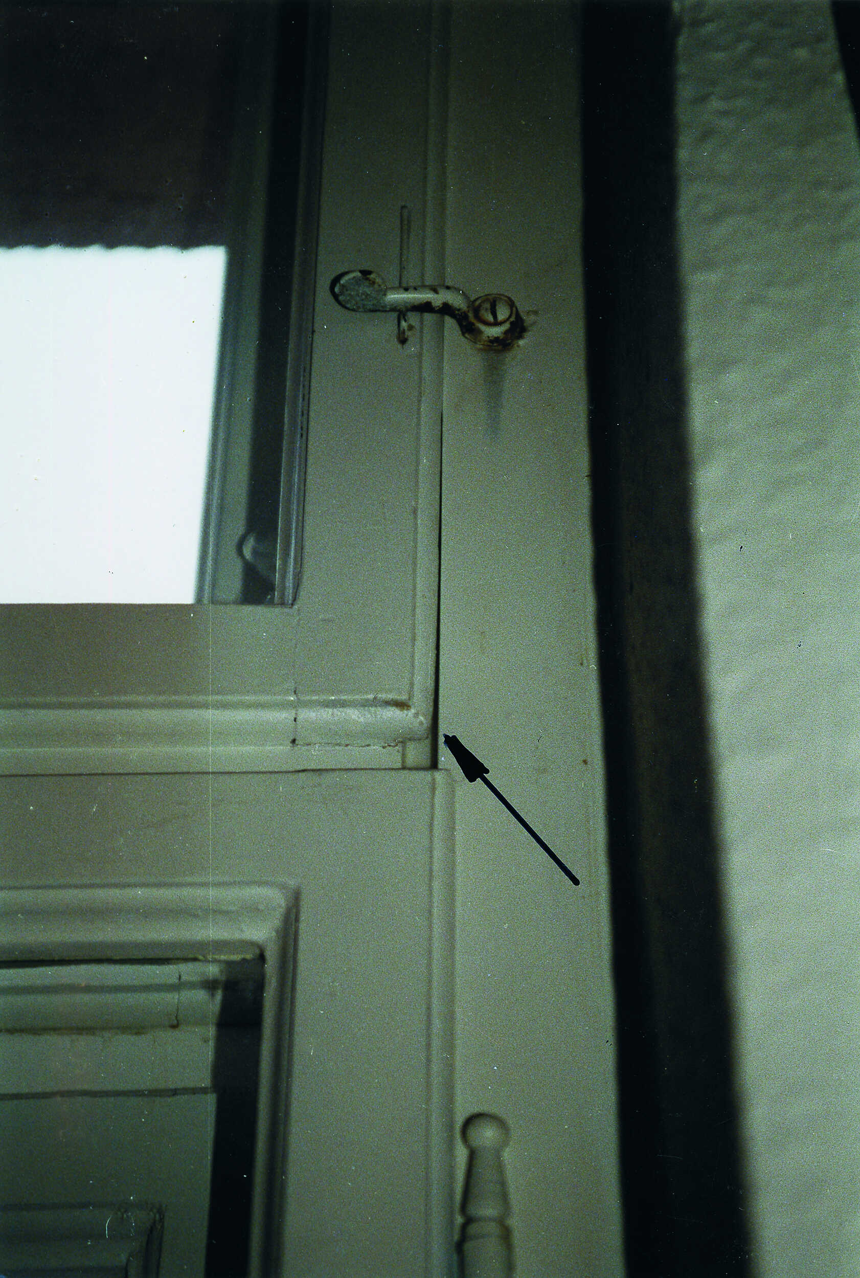 An diesem Fenster fehlte der Blendrahmen über einen Streichdraht oder ein Streichblech festriegelt" >Vorreiber. Im Rahmen der Restaurierung wurde dieser ergänzt. Dies erfolgte jedoch aus nicht bauzeitlichem Material. Unverzeihlich ist die Montage dieses Vorreibers, sie erfolgte ohne die Verwendung eines entsprechenden Streichdrahtes. Infolge von Nutzung und Gebrauch wird sich das Flügelrahmenholz im Bereich des Vorreibers massiv abnutzen, insbesondere wird der Anstrich aber auch die Holzsubstanz dadurch geschädigt.
