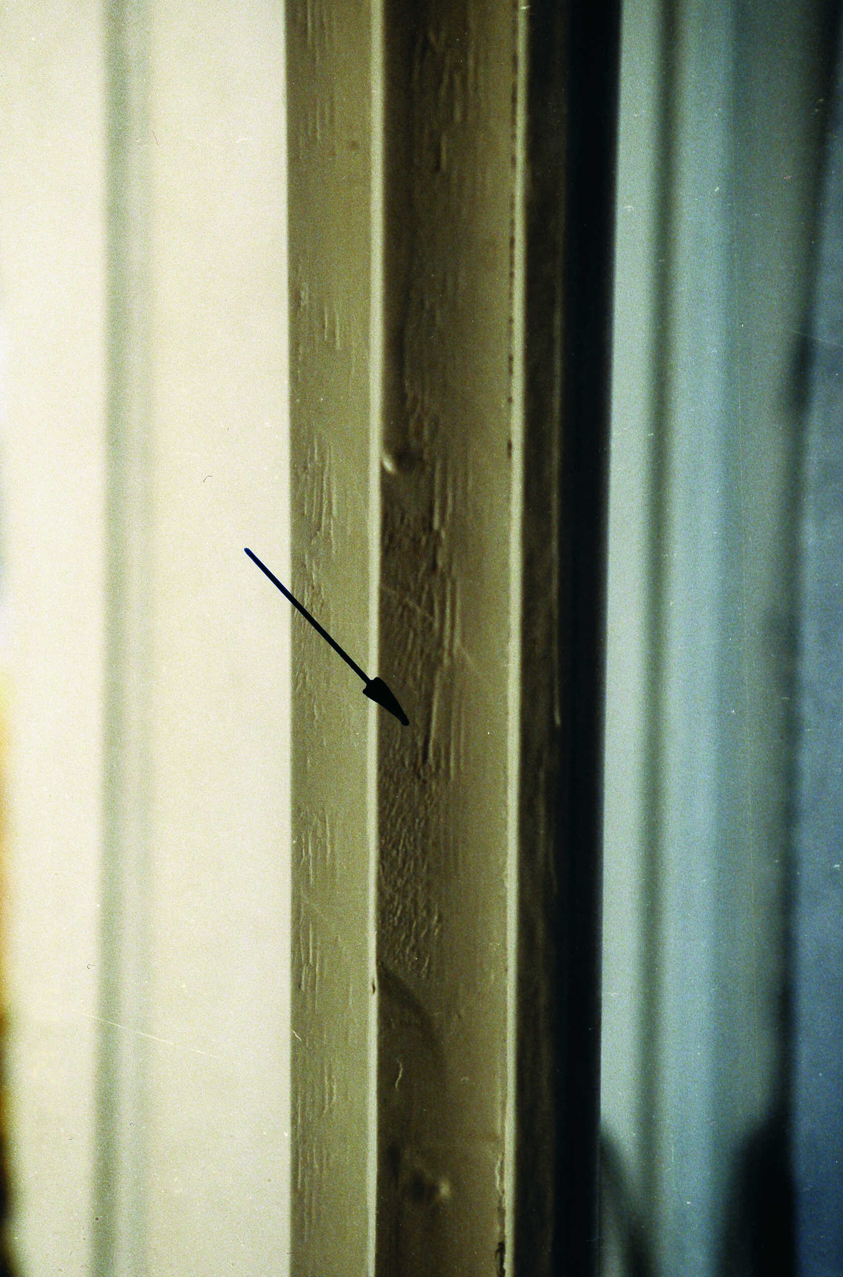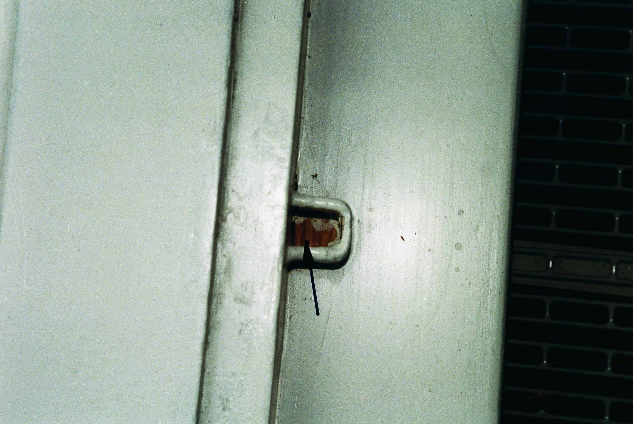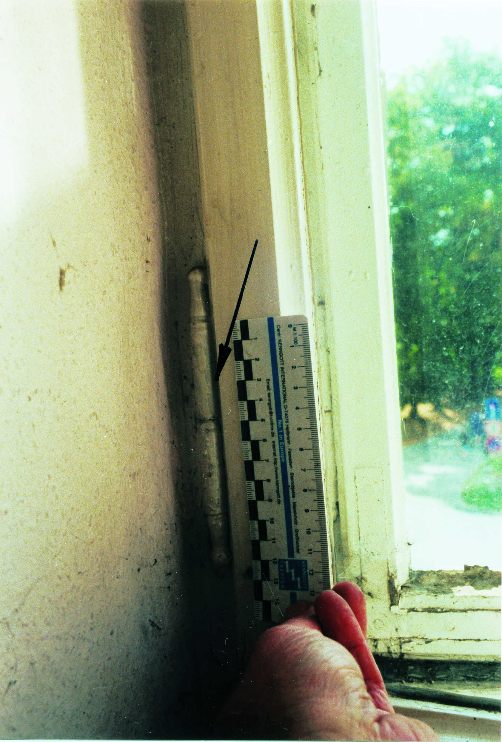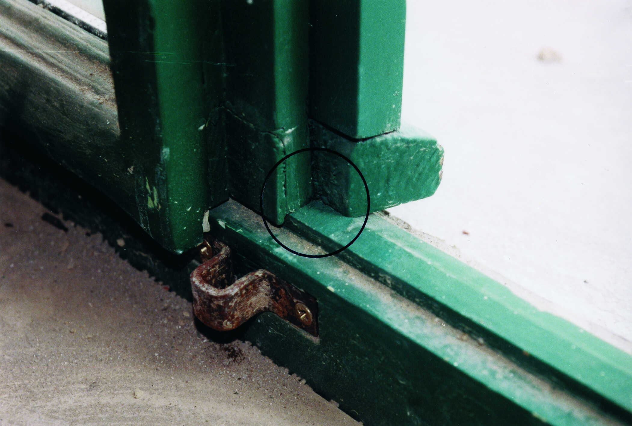 An diesem Fenster fehlte der Blendrahmen über einen Streichdraht oder ein Streichblech festriegelt" >Vorreiber. Im Rahmen der Restaurierung wurde dieser ergänzt. Dies erfolgte jedoch aus nicht bauzeitlichem Material. Unverzeihlich ist die Montage dieses Vorreibers, sie erfolgte ohne die Verwendung eines entsprechenden Streichdrahtes. Infolge von Nutzung und Gebrauch wird sich das Flügelrahmenholz im Bereich des Vorreibers massiv abnutzen, insbesondere wird der Anstrich aber auch die Holzsubstanz dadurch geschädigt.