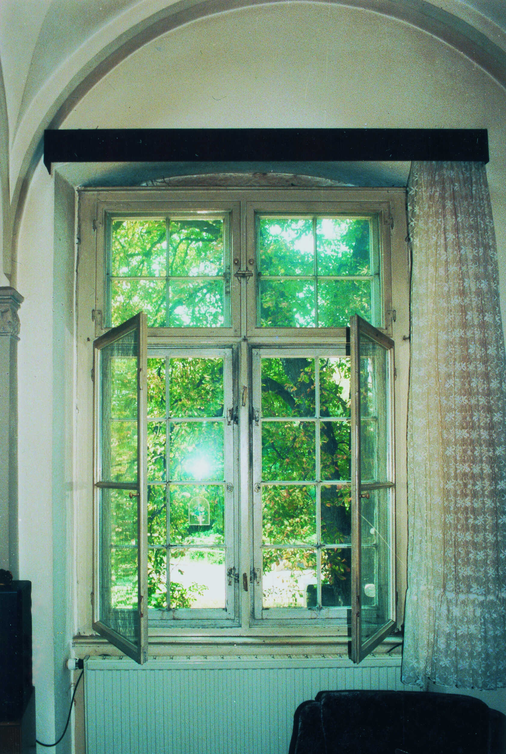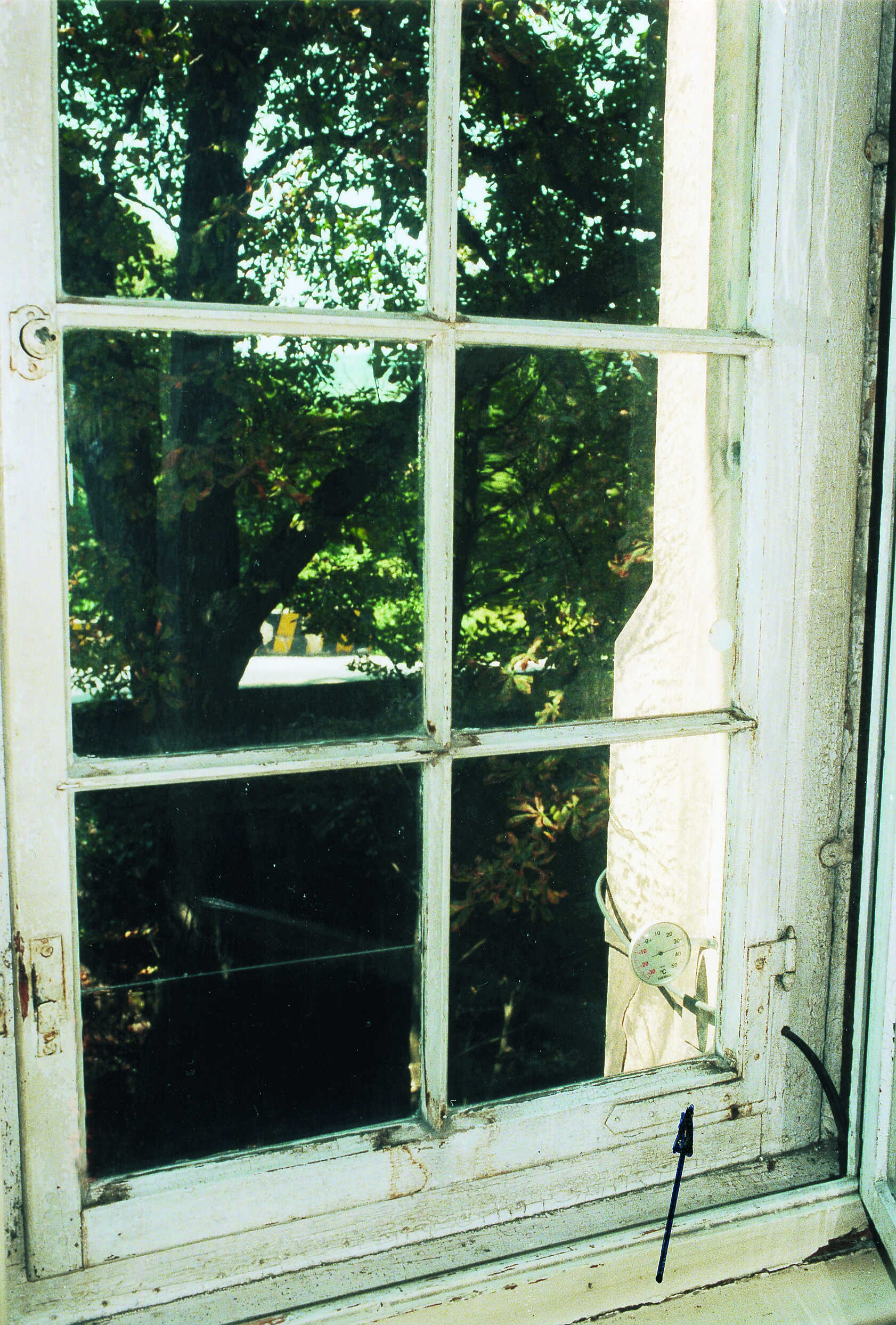In den Oberflügeln dieses Fensters befinden sich jeweils eine quer- und eine senkrecht verlaufende Holzsprosse.