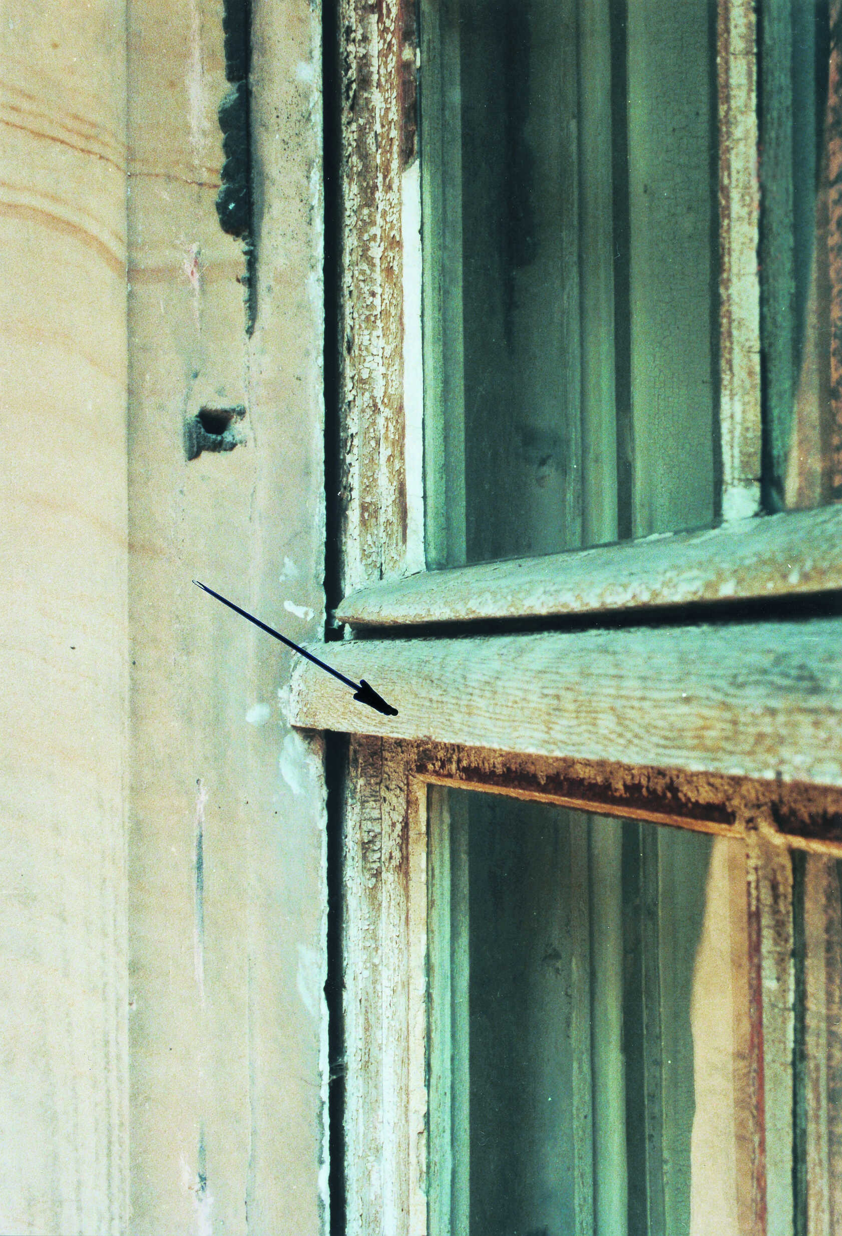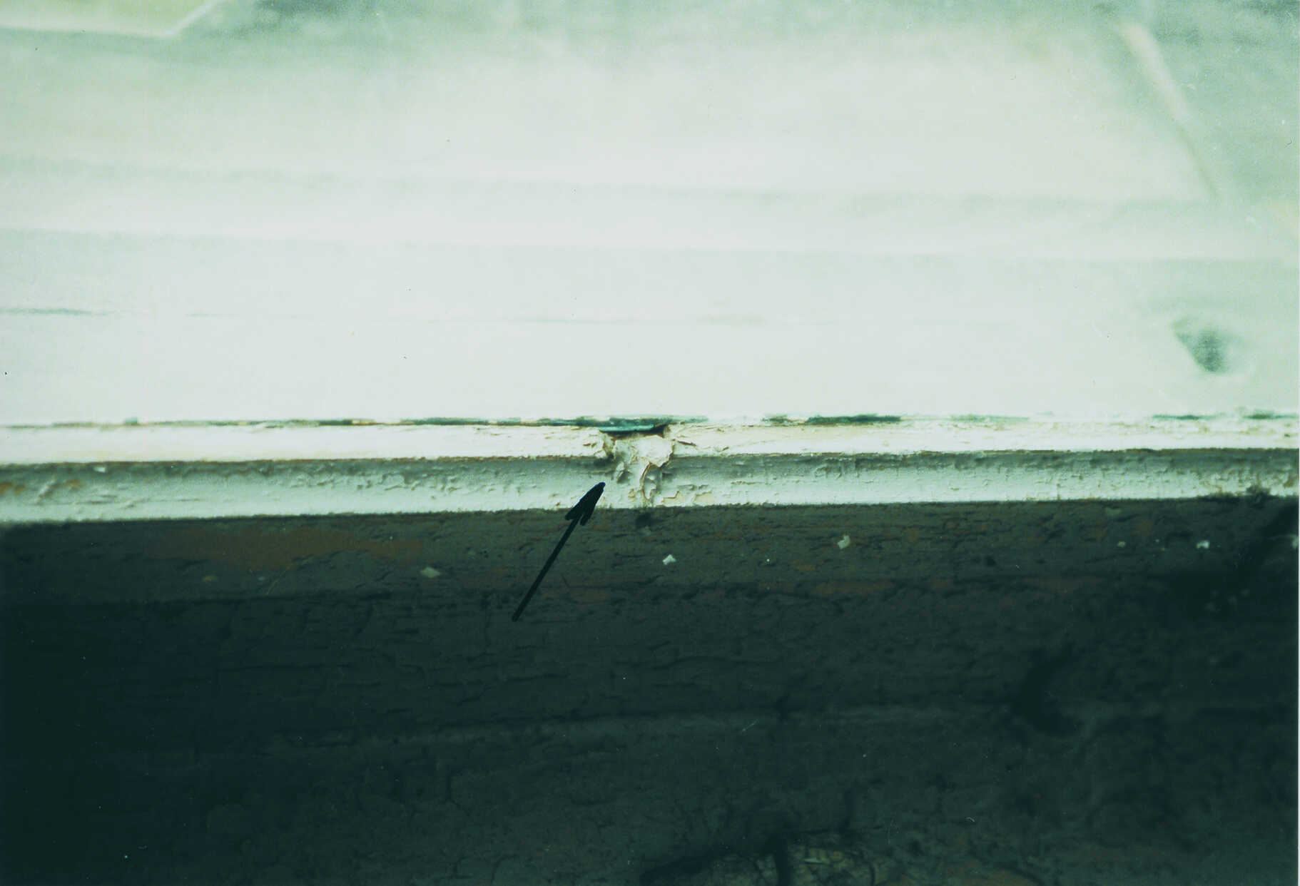Im Rahmen der Restaurierung wurde dieses Fenster, einschließlich der Sonnenschutz-Jalousie aus der Bauöffnung herausgenommen. Bei der anschließenden Neumontage gelangte eine Befestigungsschraube in den Konstruktionsfalz des Fensterrahmens. Der Handwerker hat den entstandenen Schaden nicht dadurch beseitigt, dass die entsprechende Befestigungsschraube wieder herausgedreht und die entstandene Öffnung fachgerecht verschlossen wurde. Vielmehr wurde die Schraube selbst mit einem Anstrich versehen und darauf vertraut, dass der Bauherr diesen Schaden nicht bemerkt.