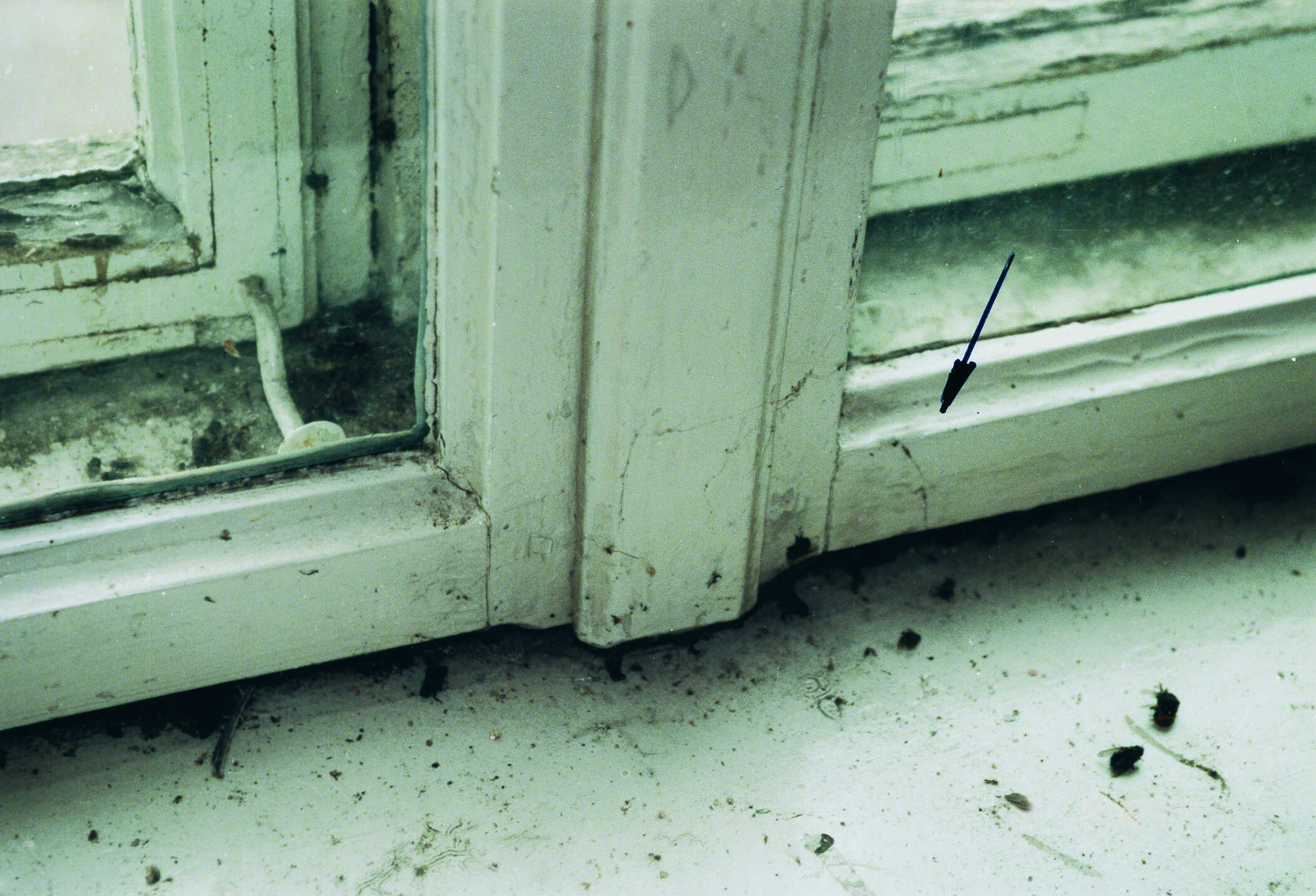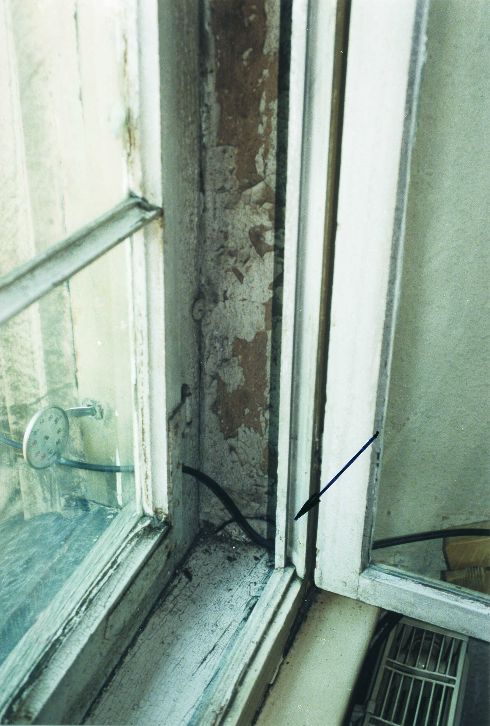 Im Rahmen der Restaurierung wurden entweder Fensterflügel vertauscht oder die Bearbeitung erfolgte bei zu großer Holzfeuchte. Eindrucksvoll ist die übergroße Spaltluft im Konstruktionsfalz zu erkennen. In der ersten Abbildung wird dies mit einem eingeschobenen Lineal nochmals unterstrichen. Sämtliche Fenster sind absolut unzureichend luftdicht. Als Folge daraus kann ungehindert mit Feuchte geladene Raumluft in den Scheibenzwischenraum des Kastenfensters eindringen. In der kalten Jahreszeit kondensiert dann diese Luft an der kalten Glasfläche des Außenfensters und es entsteht Tau- oder Schwitzwasser.