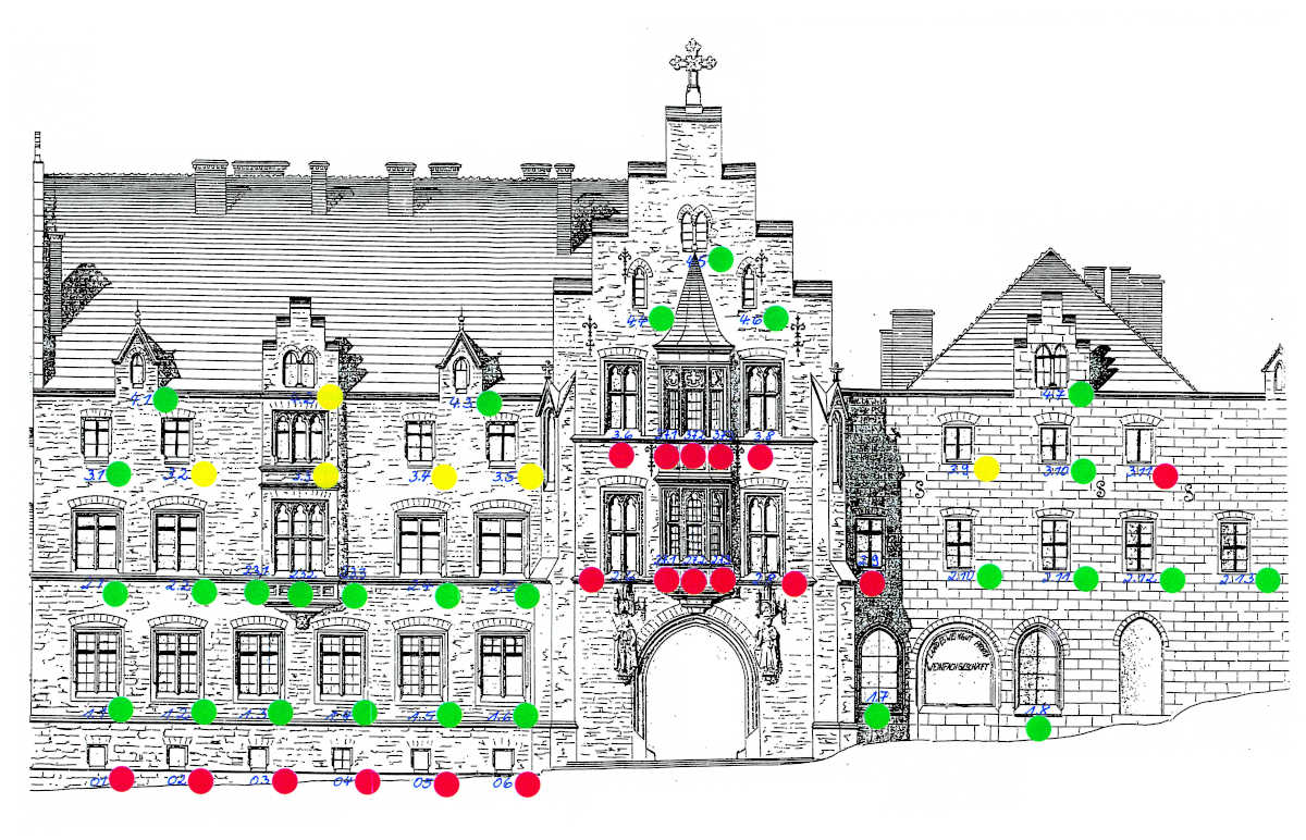 Liegt der Restaurierungsaufwand unter dem Aufwand für die baugleiche Neuanfertigung zuzüglich Restaurierungsaufschlag von 20 Prozent, erfolgt die Einstufung als restaurierungsfähig – grüner Punkt in der Zeichnung.
