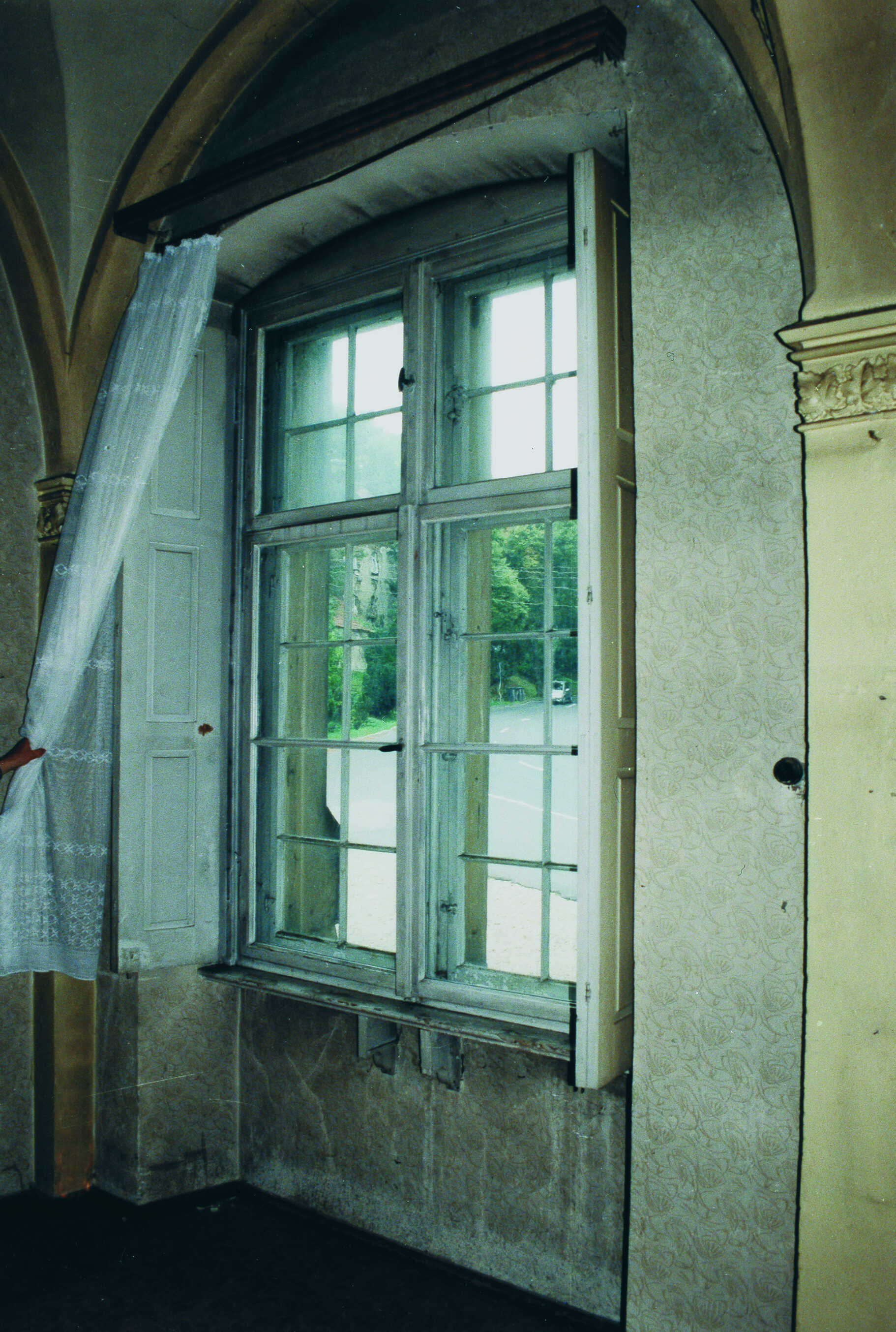 Im Rahmen der Restaurierung wurde an diesem Flügelpaar der sogenannte »Puffer« entfernt. Das Schraubloch, in dem sich offenbar dieser Puffer ursprünglich befunden hat, ist noch deutlich zu erkennen. Aufgrund des Fehlens dieses Puffers schlägt nunmehr die Fenstergriffolive des Außenflügels in die Glasfläche des Innenflügels. Beim Betätigen dieser Fensterflügel besteht daraufhin Glasbruchgefahr.