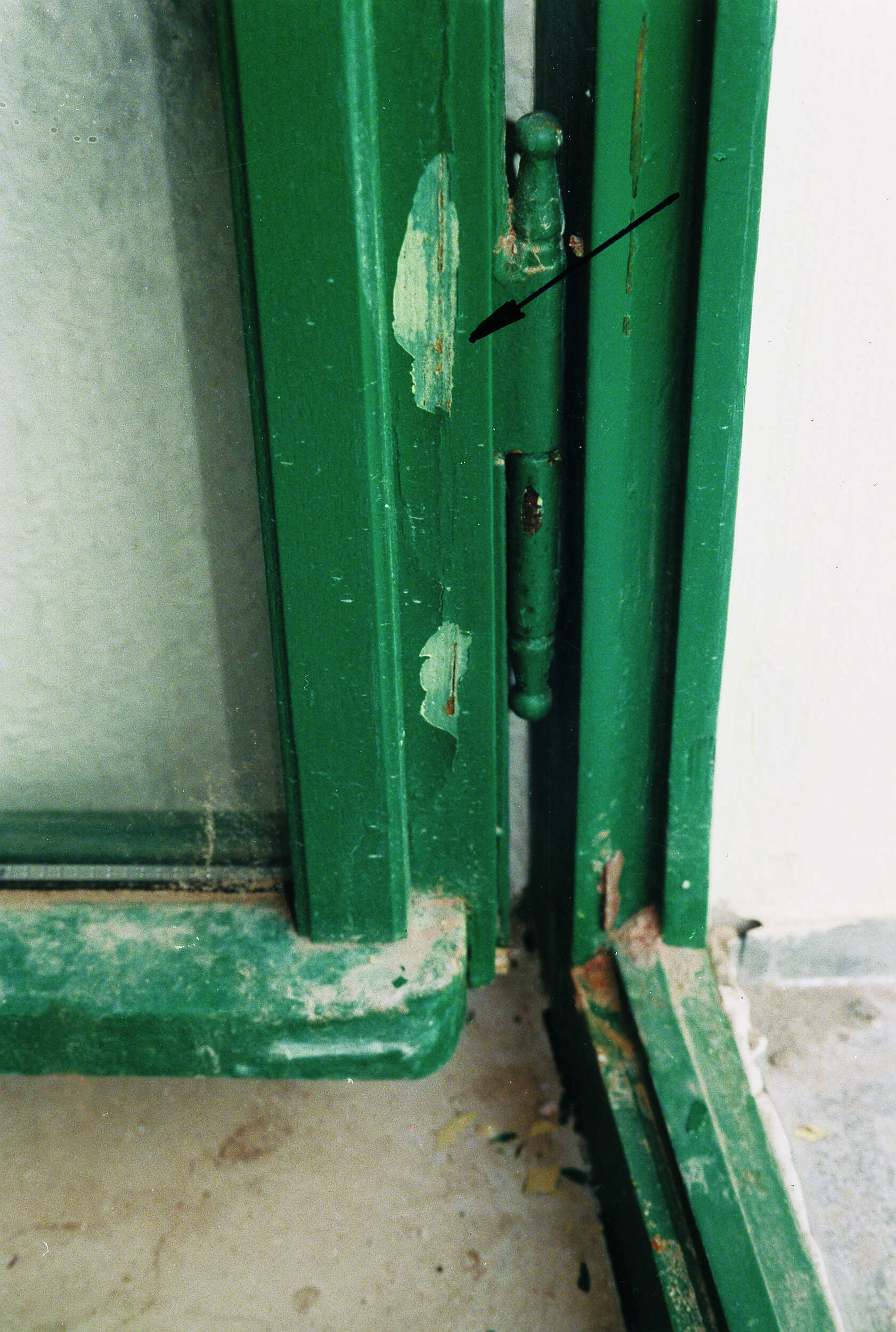 Offensichtlich wurden bei der Restaurierung die Fensterflügel vertauscht oder die Bänder entfernt. Es ist deutlich zu erkennen, dass die Bänder nicht aufeinander abgestimmt sind. In diesem Fall ist eine fachgerechte Lastabtragung nicht möglich. Die Eigenlast des Flügels wird hier nur über das darüberliegende Band abgetragen.