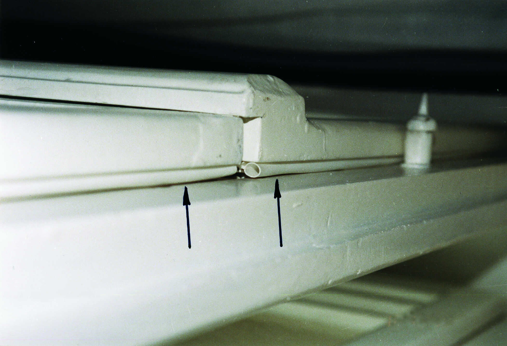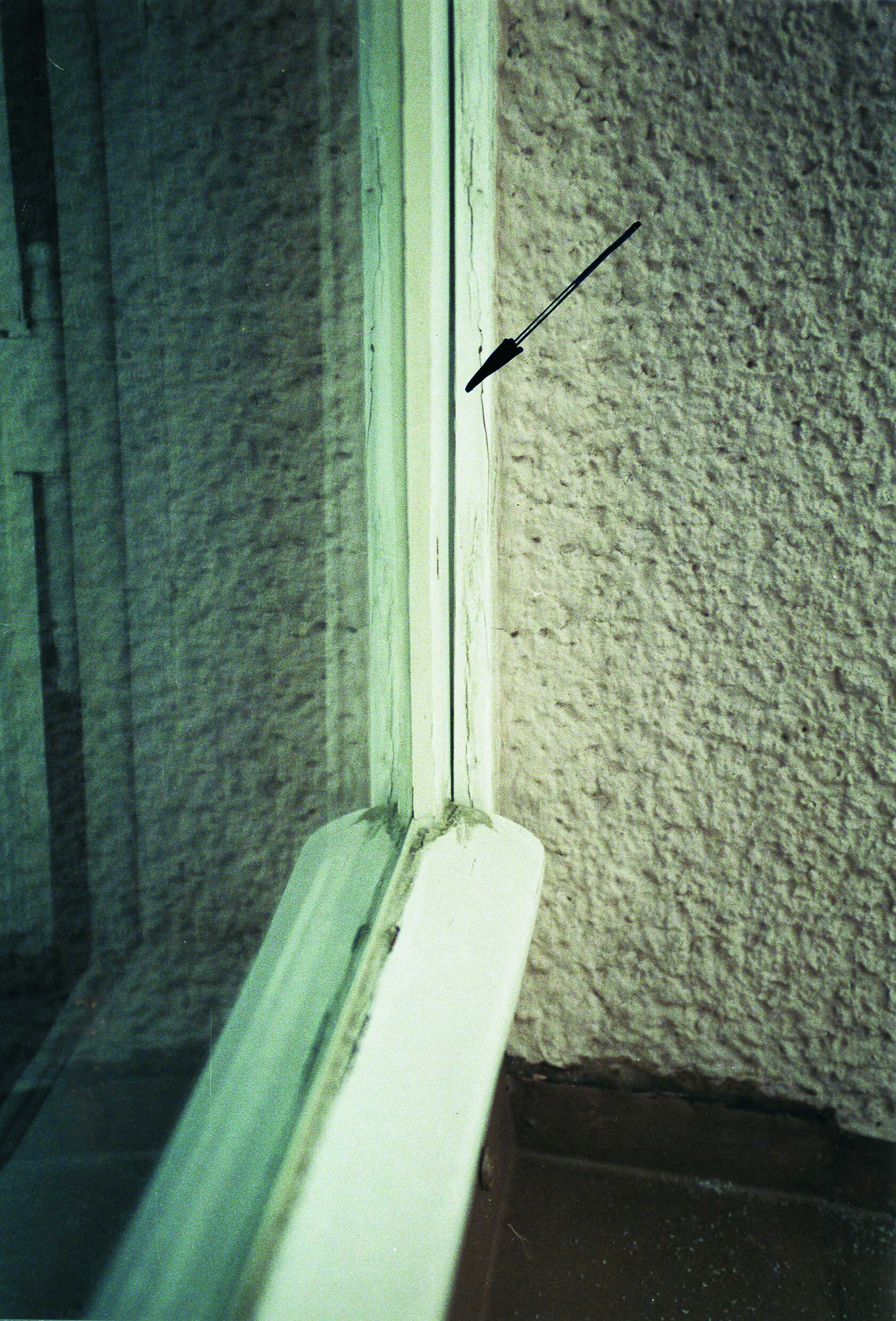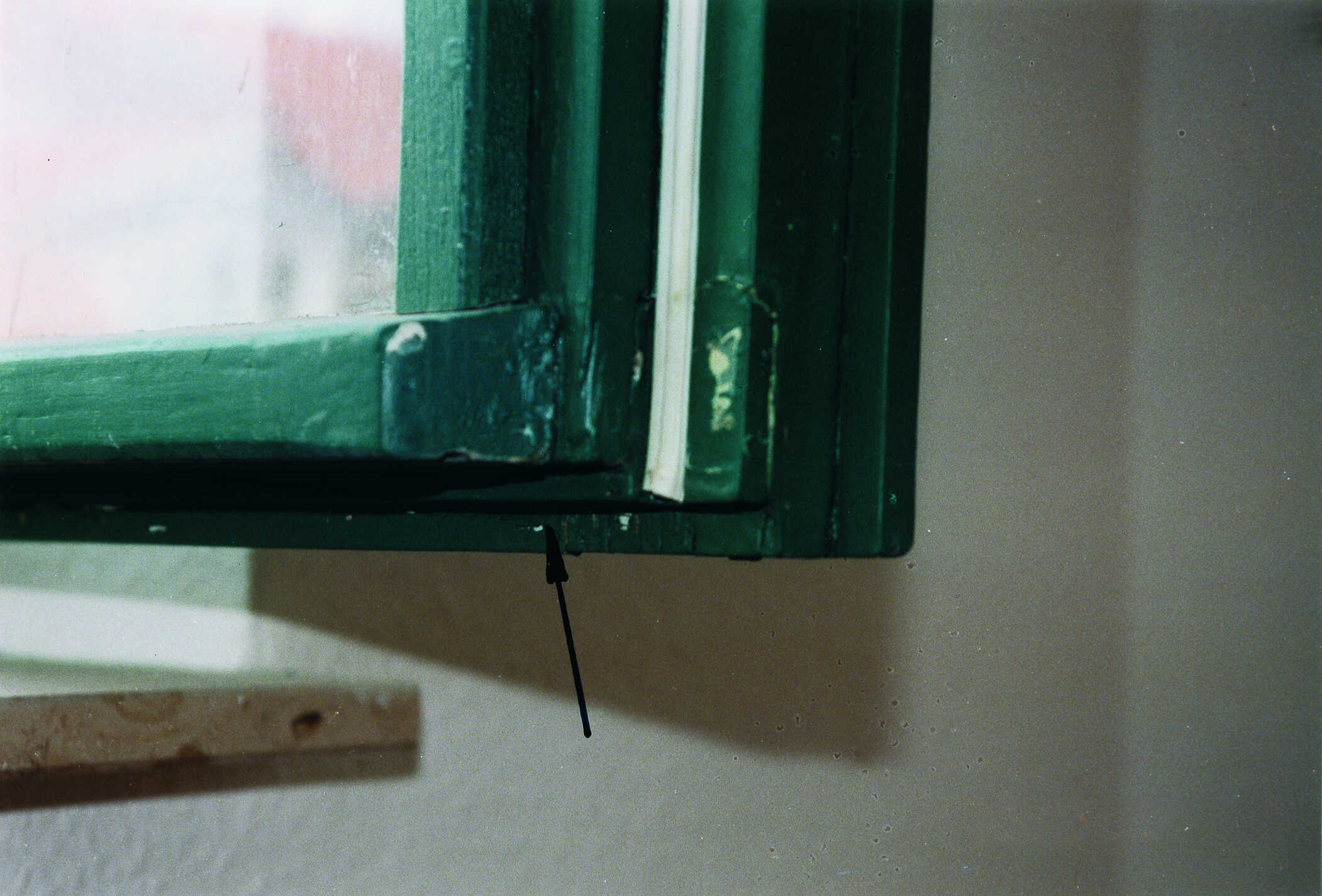 Hier ist die Spaltluft eines Fensters in Stulpkonstruktion im Bereich des Wetterschenkels zu erkennen. Dabei wird sichtbar, dass diese Spaltluft deutlich zu groß ist. Als Folge daraus dringt nahezu ungehindert Luft- und Niederschlagsfeuchtigkeit über den Stulpbereich ins Rauminnere. Dieses Fenster ist unzureichend luft- und regendicht.