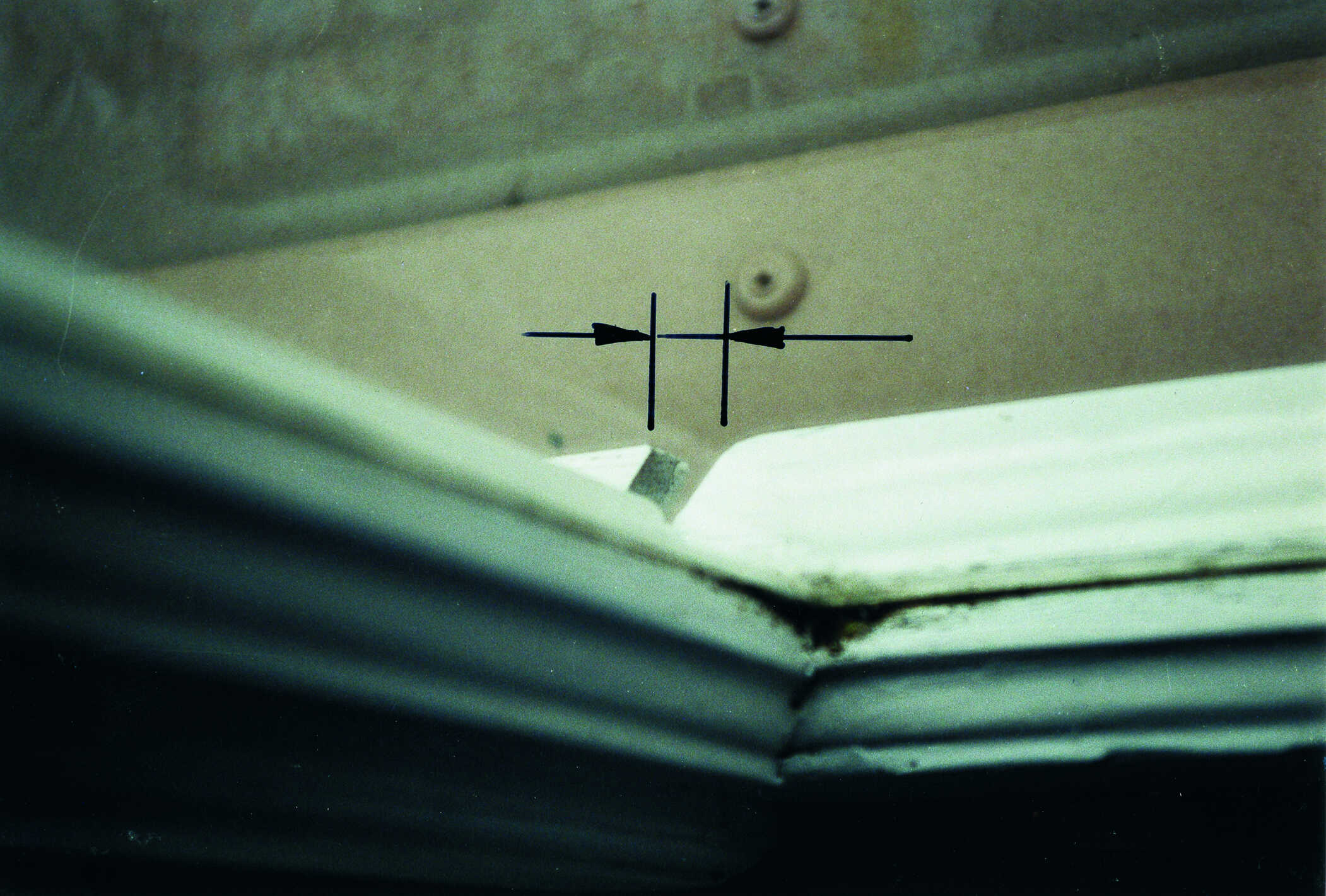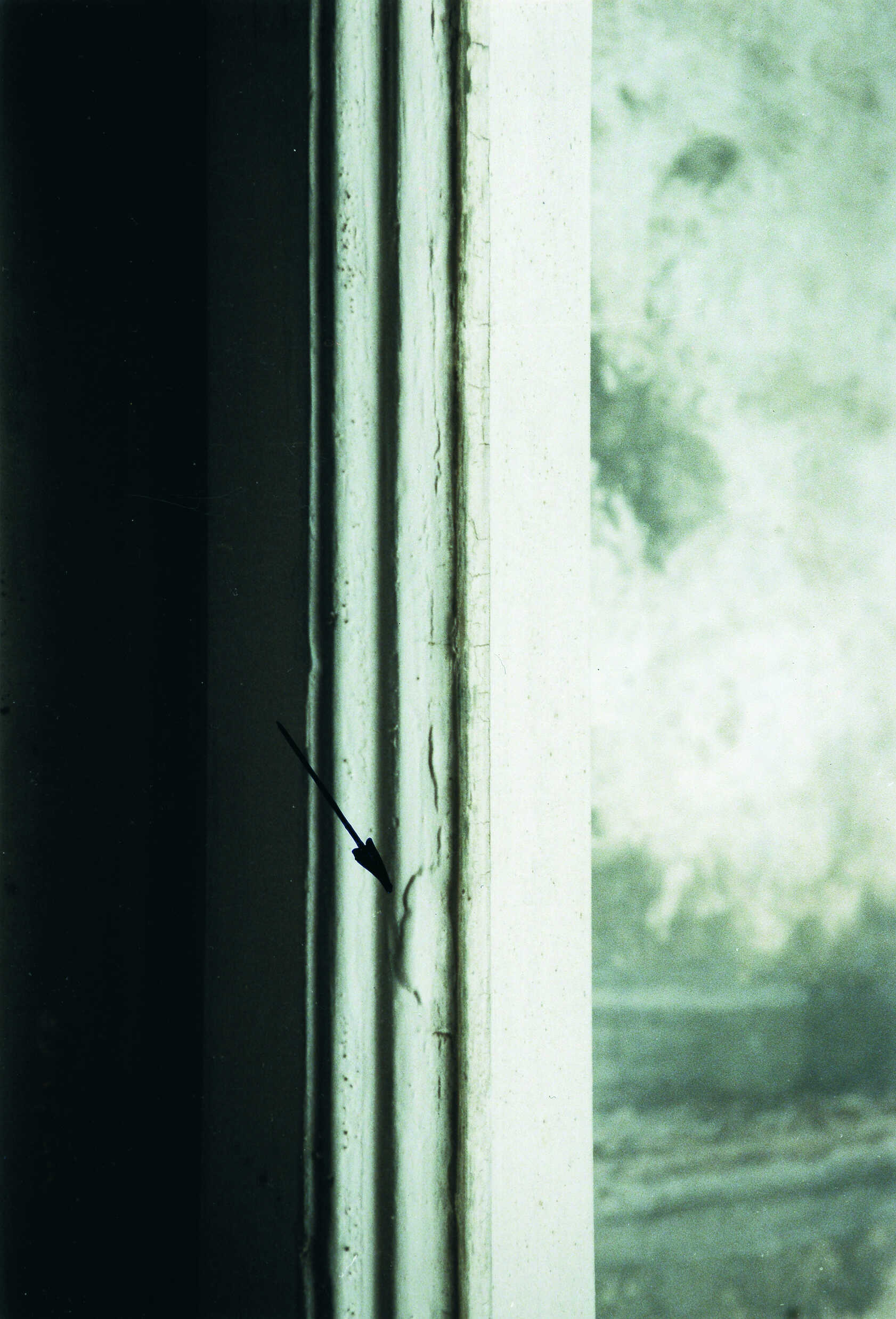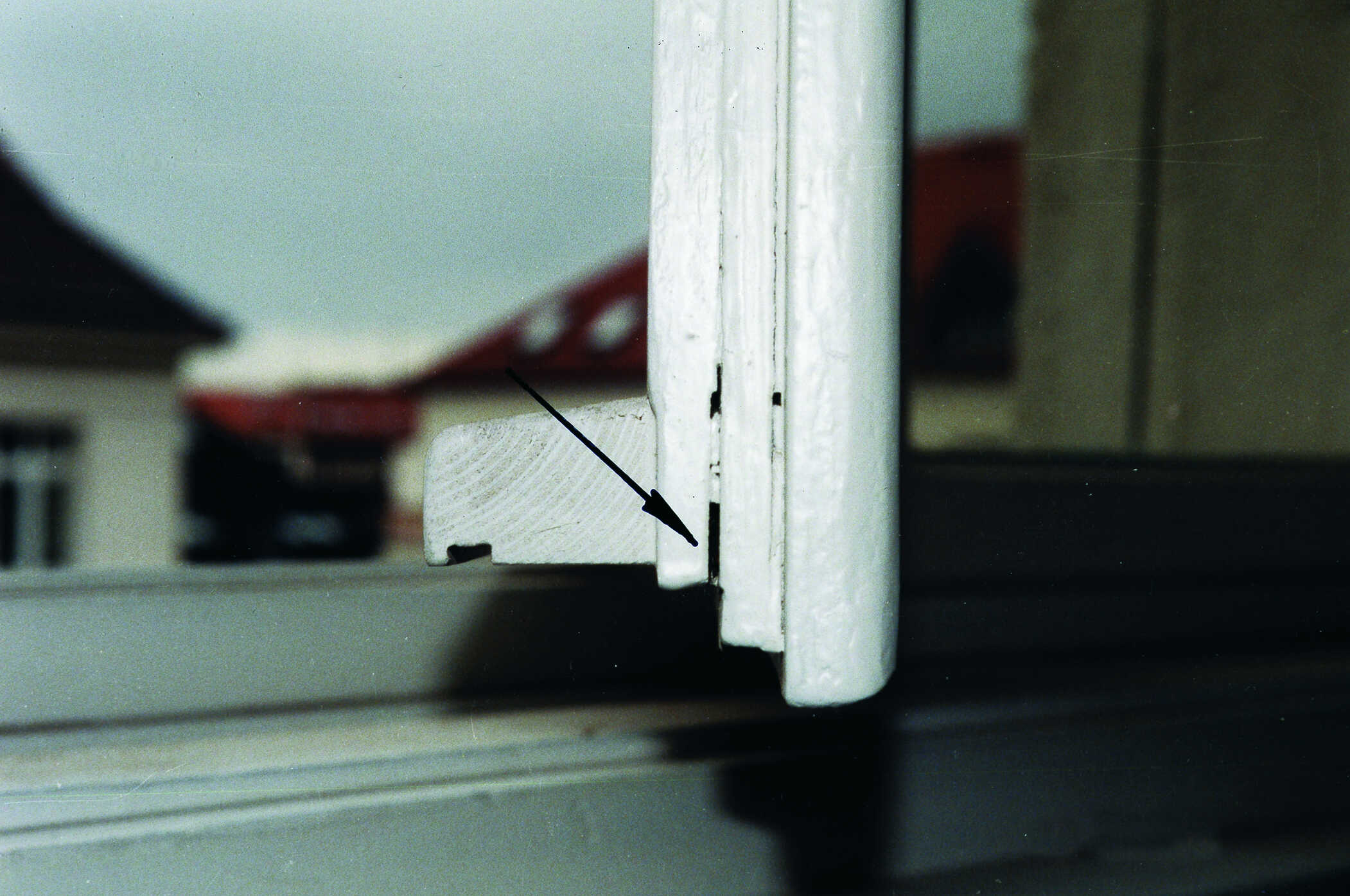 Hier ist die Spaltluft eines Fensters in Stulpkonstruktion im Bereich des Wetterschenkels zu erkennen. Dabei wird sichtbar, dass diese Spaltluft deutlich zu groß ist. Als Folge daraus dringt nahezu ungehindert Luft- und Niederschlagsfeuchtigkeit über den Stulpbereich ins Rauminnere. Dieses Fenster ist unzureichend luft- und regendicht.