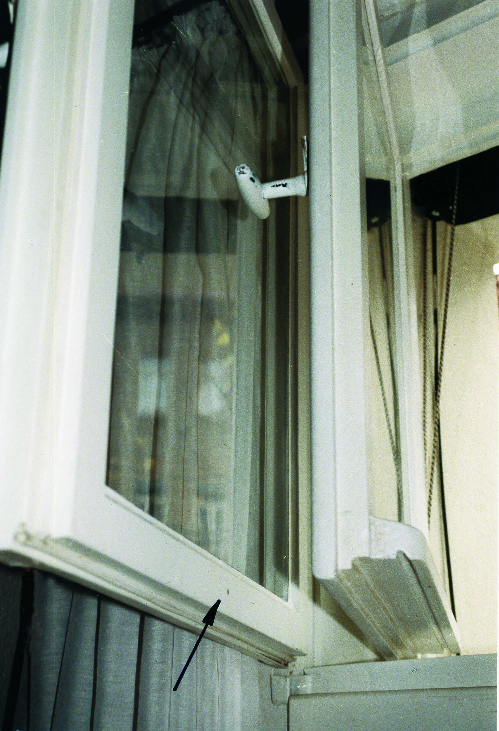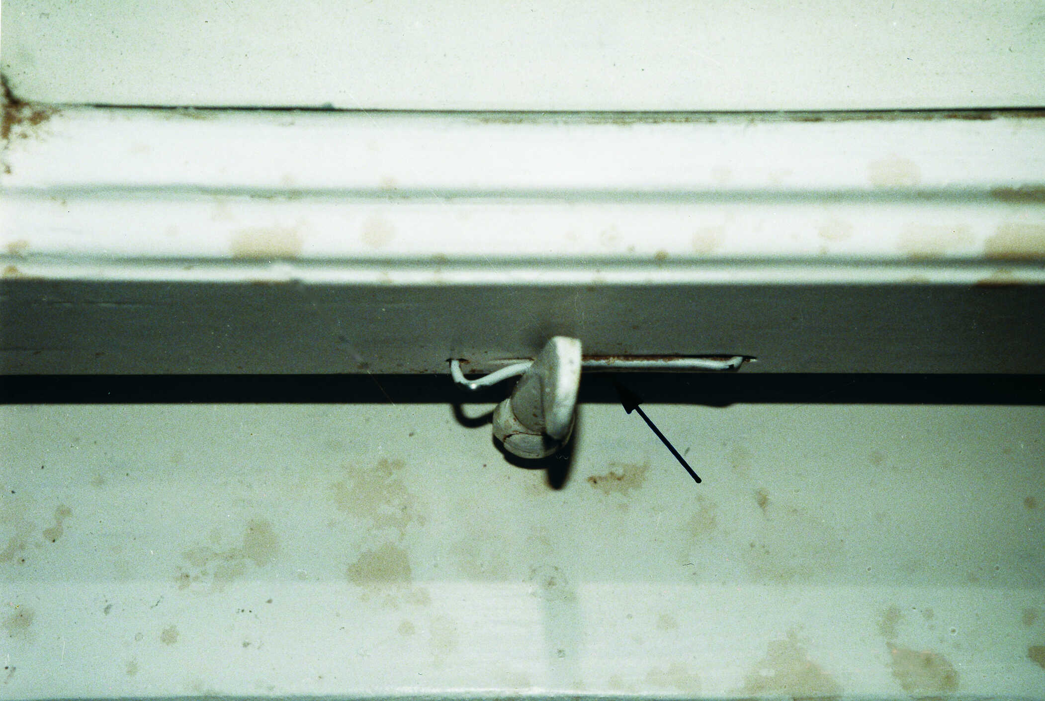 Hier ist ein Blendrahmen über einen Streichdraht oder ein Streichblech festriegelt" >Vorreiber zur Schließunterstützung auf der Unterseite eines Fensters zu erkennen. Er dient dazu, den linken Fensterflügel eines Stulpfensters nach Öffnen des rechten Flügels zum Blendrahmen hin zu arretieren. Im Rahmen der Restaurierung wurde jedoch der Streichdraht, auf dem der Vorreiber gleitet, nicht fachgerecht angebracht. Der Vorreiber ist in seiner Verschlussstellung nicht ausreichend nach links geneigt. In der derzeitigen Ausführung besteht bei einer entsprechenden Leichtgängigkeit die Gefahr, dass der Vorreiberverschluss sich selbständig öffnet.