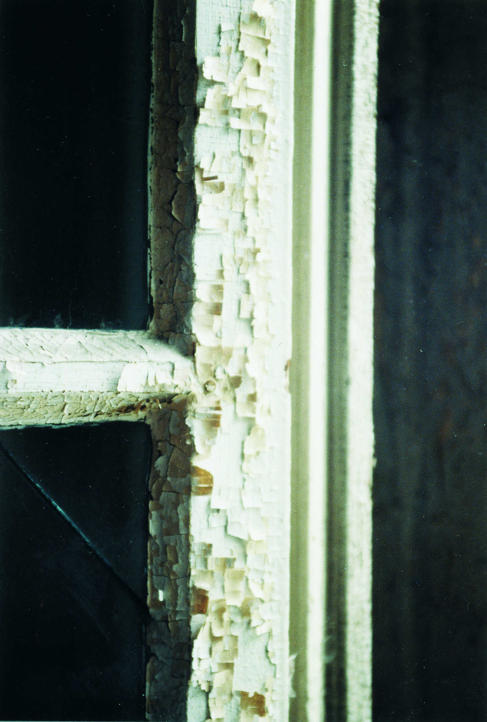 An diesem Fenster wurden die Anstriche im Rahmen der Restaurierung mechanisch mittels Heißluft und Spachtel entfernt. Dies erfolgte jedoch unzureichend. Zahlreiche lose Altanstriche – wie im Bereich der Lichtfase eines Fensterflügels gut erkennbar – wurden beim Neuanstrich nur überstrichen.