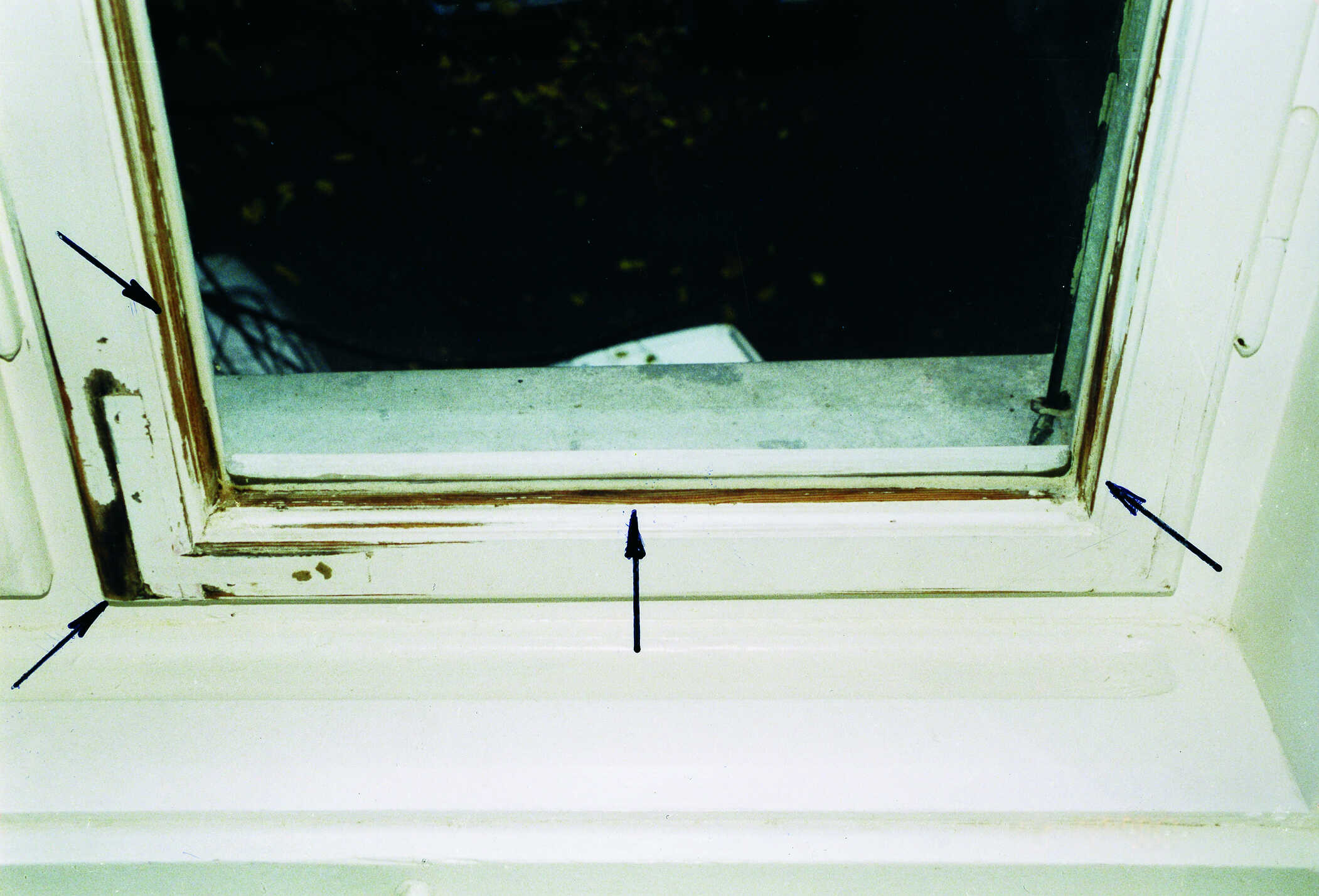 Auch an diesem Fenster wurden die Altanstriche durch chemische Laugen entfernt. Zwangsweise wird dabei der Holzsubstanz Unmengen an Feuchtigkeit in Form von Wasser zugefügt. Dabei kommt es zur Volumenvergrößerung der Holzsubstanz (Holz quillt). Als Folge daraus lösen sich nahezu alle Rahmeneckverbindungen. Eine erforderliche Ecksteifigkeit der Rahmen ist dabei vielfach nicht mehr gegeben. Weiterhin kann trotz aufgebrachtem Schutzanstrich über offene Kapillar- oder Spaltfugen zusätzliche Feuchtigkeit in die Rahmenkonstruktion eindringen und holzzerstörend wirken.
