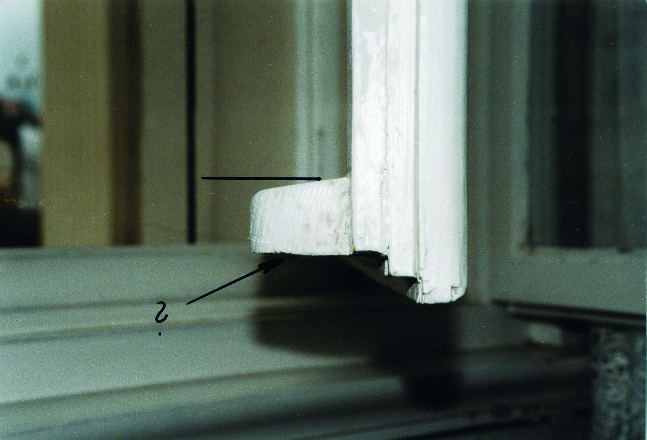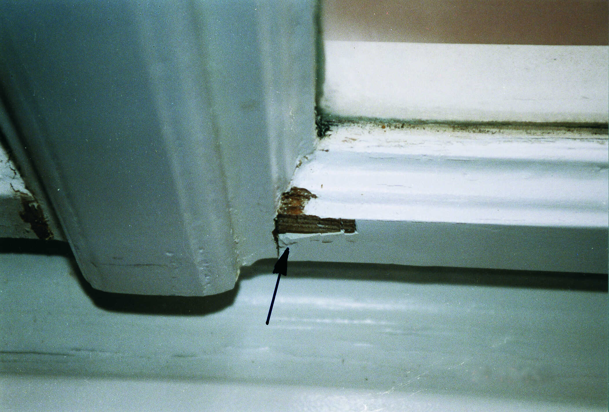 Nach erfolgter Restaurierung wurde hier offensichtlich festgestellt, dass die Fensterflügel nicht ausreichend bedienfähig sind. Mittels Hobel wurde hier versucht, die Spaltluft im Konstruktionsfalz zu vergrößern. Neben einer unsauberen Spanabnahme wurde ein erneuter Schichtaufbau der Oberflächenbeschichtung nicht mehr erbracht.