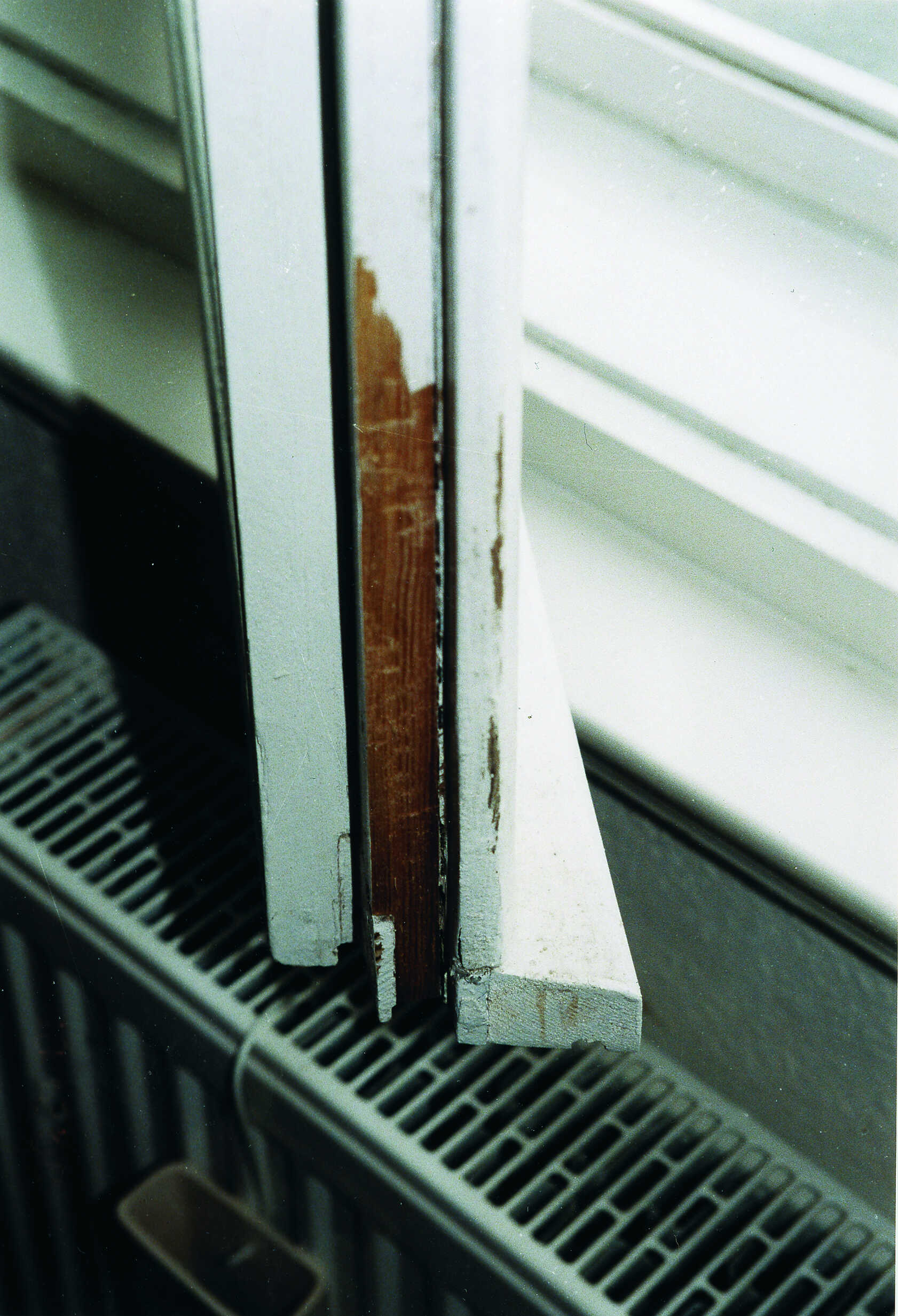 Im Rahmen der Restaurierung wurde an diesem Kastenfenster eine offene Fuge zwischen Zargenrahmen und Außenfenster nicht fachgerecht verschlossen. Infolgedessen ist diese Fuge nach kurzer Zeit wieder aufgerissen, wodurch Undichtheiten zwischen den Fensterflächen entstanden sind.