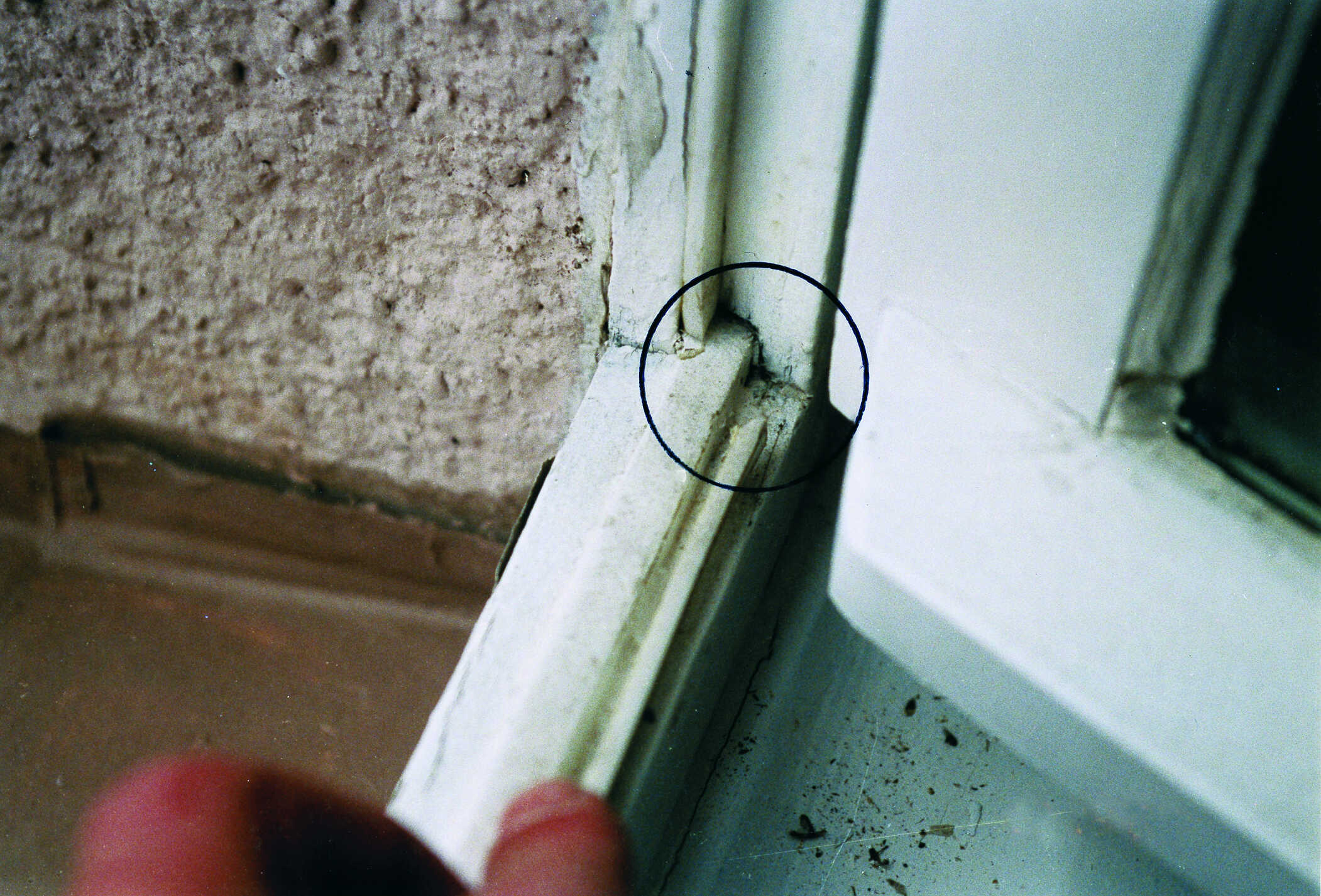 Die Dichtprofile wurden unzureichend verarbeitet. Über die vorhandenen Öffnungen kann ungehindert Luft- und Niederschlagsfeuchtigkeit in das Rauminnere eindringen. Dadurch ist auch dieses Fenster unzureichend luft- und regendicht.