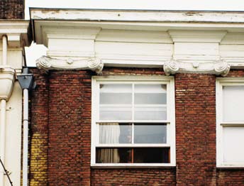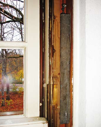 Ein Krefelder Wohnhaus der 1920er Jahre gibt Rätsel auf: Für ein filigranes, einflügeliges Drehfenster mit drei Quersprossen ist das Öffnungsmaß einfach zu groß. Wie sollte es anders sein, es handelt sich hier um ein Vertikalschiebefenster, und zwar um das mit dem wahrscheinlich schmalsten Stulp, der je gebaut wurde – etwa 25 Millimeter (Abb. 39).