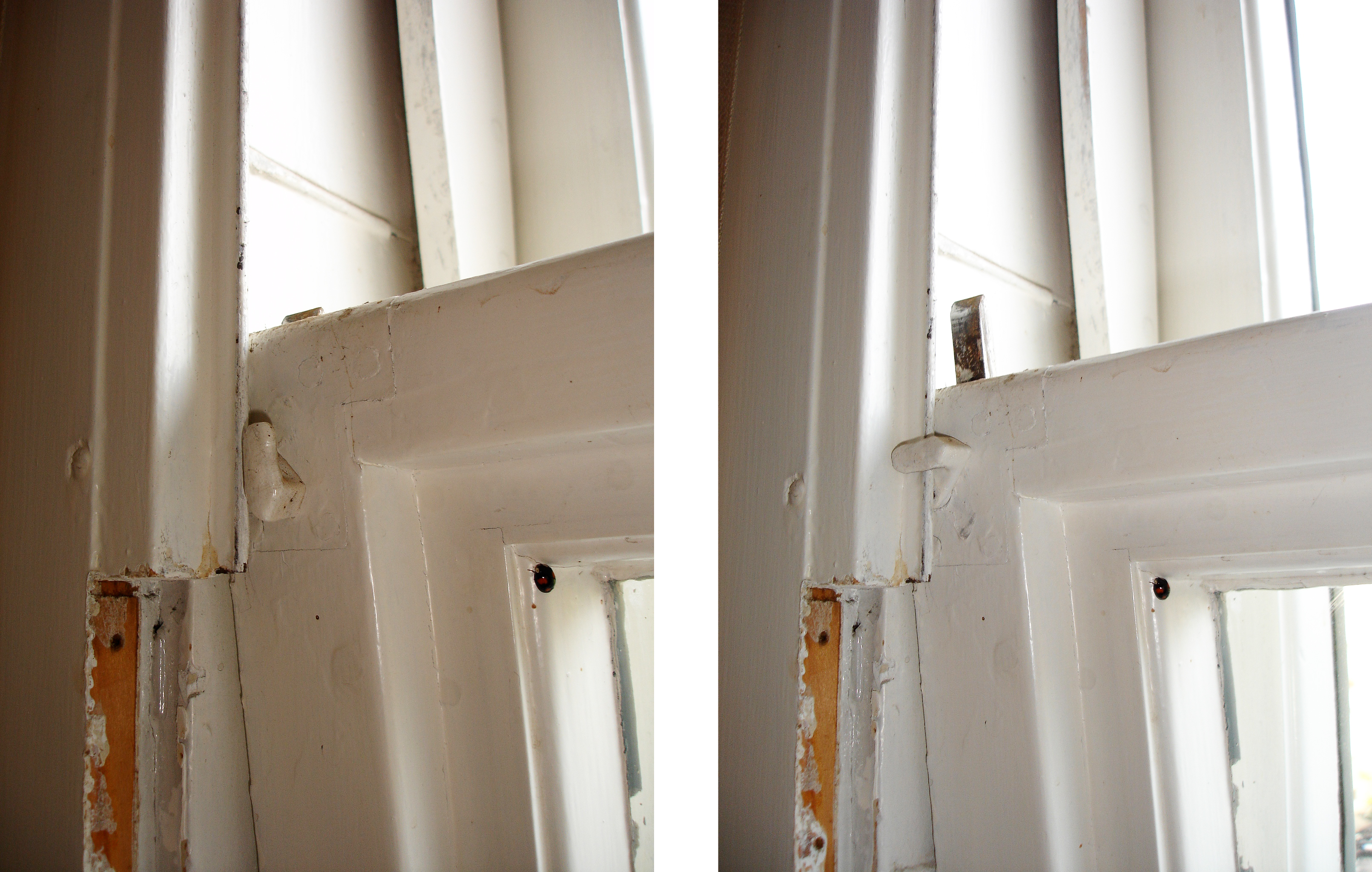 Abb. 24–28 zeigen Schiebefenster in einem Krefelder Wohnhaus. Das raumseitig geführte Unterlicht ist hier ganz nach oben, das auf der Außenseite laufende Oberlicht ganz nach unten geschoben und nach innen gekippt (Abb. 24). Soll der Flügel zur Reinigung in dieser Lage bleiben, benötigt man einen freundlichen Helfer mit Geduld und trainierter Muskulatur. Ein passend zugesägter Besenstiel hält den Flügel allerdings auch. Versagt der freundliche Helfer oder tritt jemand den Besenstiel weg, dürfte der Flügel durch sein erhebliches Gewicht an der beschlagsnahen Knickstelle an der innern Fensterbank durch die Hebelwirkung brechen. In den fast hundert Jahren des Bestehens dieses Hauses wurde offensichtlich keiner der Flügel repariert. Der respektvolle und pflegliche Umgang hat hier einen unreparierten Originalzustand erhalten. Damit die Flügel im normalen Betrieb nicht versehentlich nach innen kippen, dienen kleine Riegel als Sperre. Der Erbauer dieser Fenster hat sogar daran gedacht, dass die Breite der Fenster die Spannweite zweier menschlicher Arme überschreitet und hat deshalb die Sperrriegel unterschiedlich lang gemacht, damit sie nacheinander bedient werden können (Abb. 25).