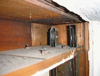 Auch in der Bahnsteighalle des Hauptbahnhofes Krefeld, im Pavillon für die Betriebsaufsicht, hatte früher ein Vertikalschiebefenster die Schalterfunktion übernommen (Abb. 37, 38). Da es sich um einen Fachwerkbau handelt und hier die Laibung gleichzeitig die statische Konstruktion ist, kann, zumal es sich um eine Ecke handelt, in der Laibung kein Gegengewichtskasten sein. Die pragmatische Lösung ist, den Kasten außen vorzuschrauben und das Seil entsprechend umzulenken (Abb. 38, links im Bild).