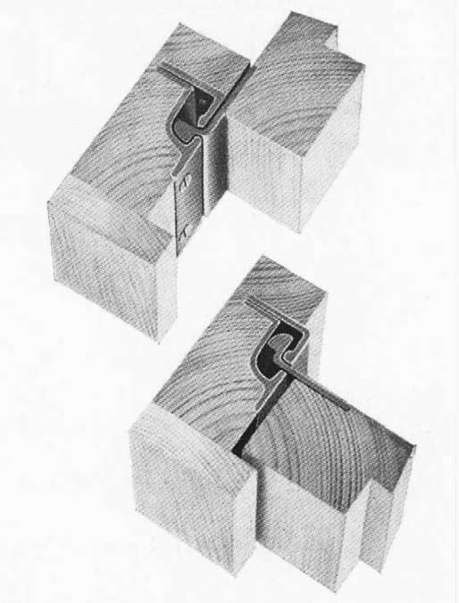 Der patentierte Geniestreich ist im fertig montieren Zustand praktisch nicht mehr zu erkennen. Spätestens, wenn man das Fenster zur Reinigung öffnet (Abb. 74) oder dies im Modell (Abb. 75) gezeigt wird, wird jedoch klar, dass der »Einschwenk-Schiebebeschlag mittels Gelenkschienen« alle bisherigen Entwicklungen hinter sich lässt. Die Gelenkschienen und damit die komplette Führung der Fenster sind aus Stahl und praktisch luftdicht. Im geschlossenen Zustand greifen zwei Stahlwinkel ineinander, die auch den ansonsten problematischen Bereich zwischen den Flügeln zuverlässig abdichten (Abb. 76, 77).