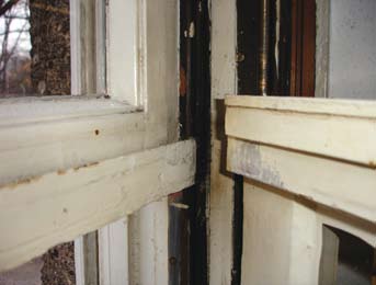 Dies war nur möglich, indem das obere Rahmenprofil des Unterflügels und das untere Profil des Oberflügels, also gewissermaßen der Stulp des Schiebefensters durch jeweils ein Stahlprofil ersetzt wurde. Das Fenster erfreut sich seit achtzig Jahren regelmäßiger Pflege in geringem Umfang. Dies und natürlich die gute Materialauswahl – schließlich wurde das Stahlprofil stumpf auf das Hirnholz geschraubt – war genug, um diesen bauphysikalischen Regelbruch bis heute zu erhalten (Abb. 40).