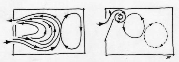 Die natürliche Lüftung scheint unerheblich, dabei funktioniert sie schon bei wenigen Grad (Kelvin) Temperaturunterschied zwischen innen und außen ohne jeglichen Technikeinsatz hervorragend. Voraussetzung ist allerdings, dass für die Strömung flache und breit liegende Spalte übereinanderliegen. Nach dem Prinzip der oben beschriebenen Strömungsdiagramme sähe das dann aus, wie Abb. 81 verdeutlicht. Im Gegensatz zu der gerne genutzten Kipplüftung bei Dreh/Kipp-Fenstern, die im Winter vorwiegend zu einer Abkühlung des Sturzes führt (Abb. 81, rechts), ermöglicht das Vertikalschiebefenster mit zwei beweglichen Flügeln einen vollständigen Luftaustausch im Raum.