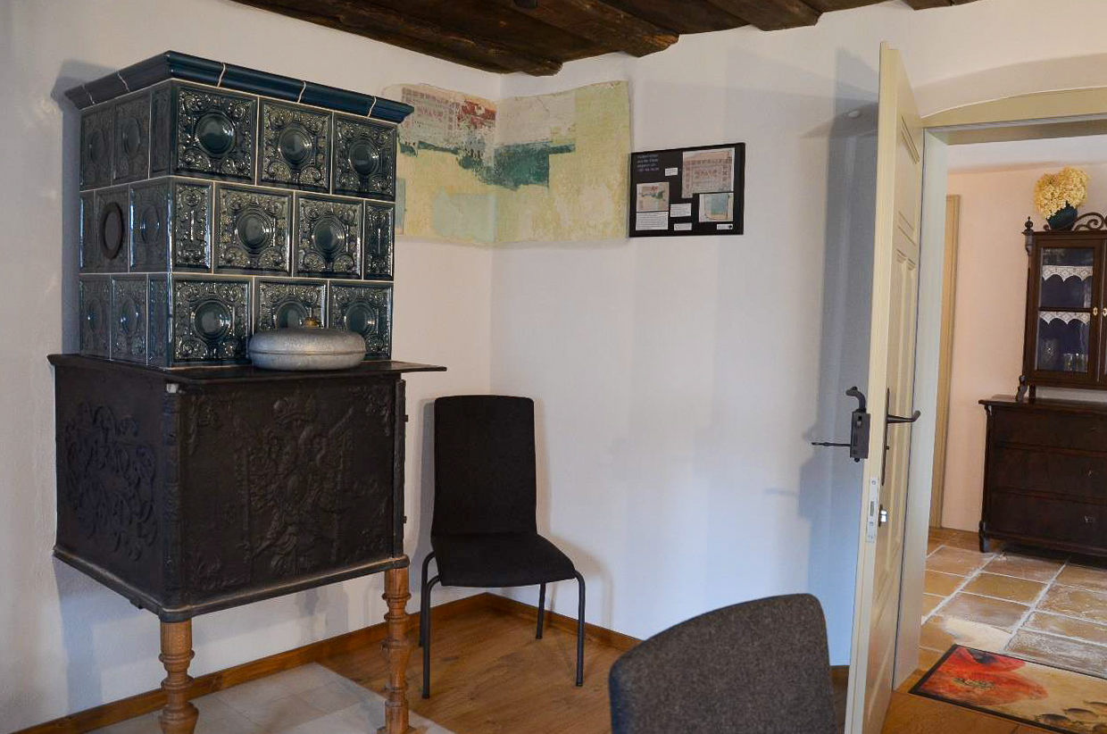 Ein in der Nähe von Treuchtlingen gefundener Kachelofen aus dem Jahr 1802 wurde restauriert und kann nun zur Beheizung der Stube genutzt werden. Sein Rauchrohr führt durch die Wand direkt in die Rußkuchl, das Herzstück des Denkmals.