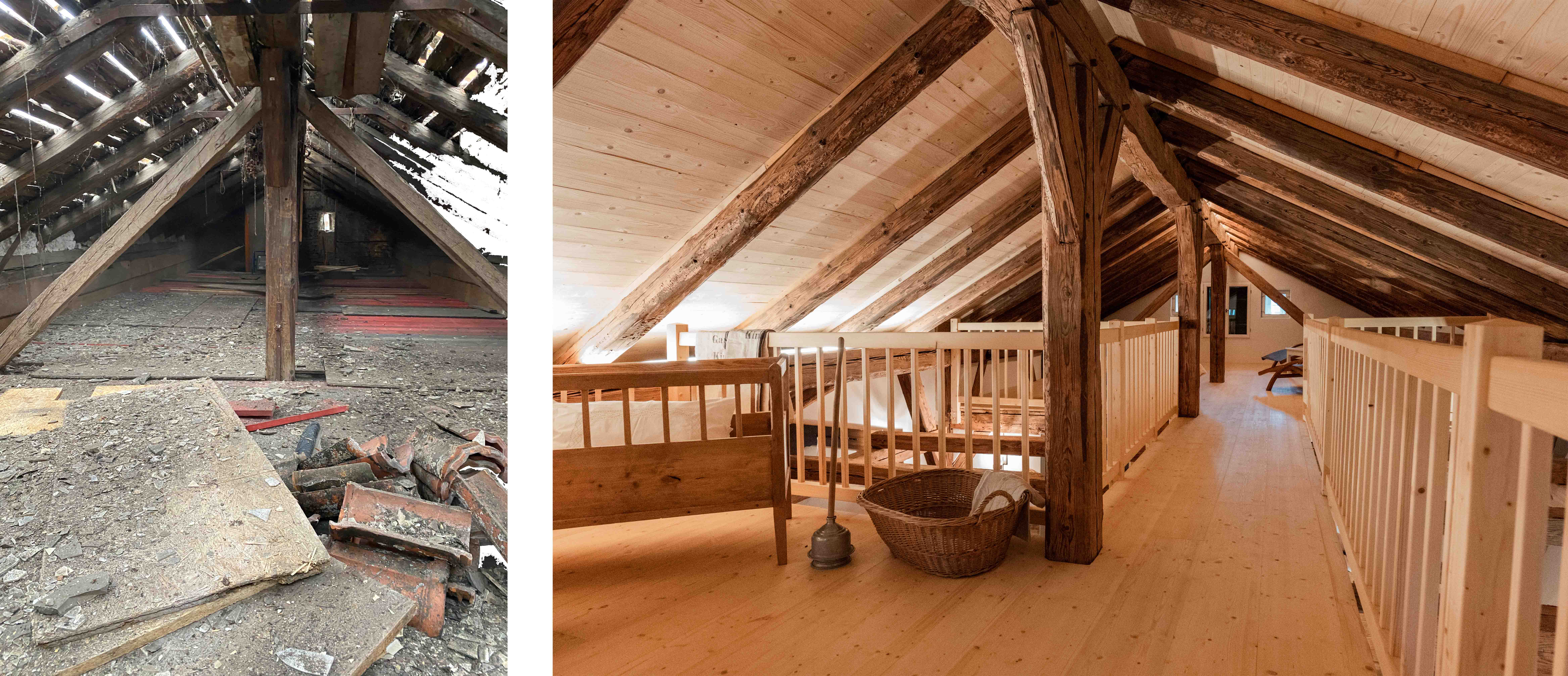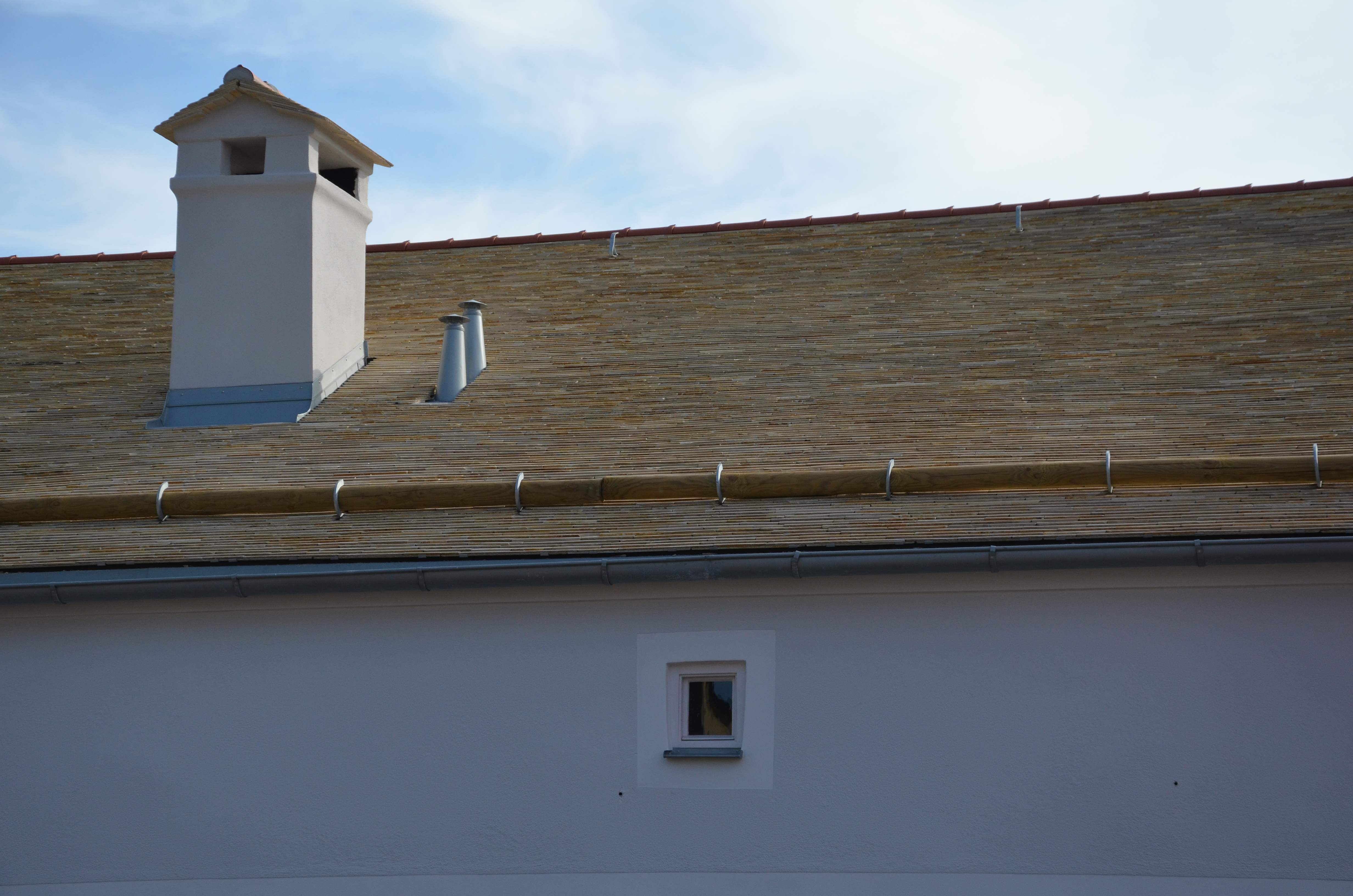 Erhebliche restauratorische Zimmererarbeiten waren notwendig und es erfolgte eine Dämmung und Neueindeckung, selbstverständlich wieder mit Kalkplatten. Ausgeführt von einem der wenigen lokalen Betriebe, die dieses Handwerk noch beherrschen.