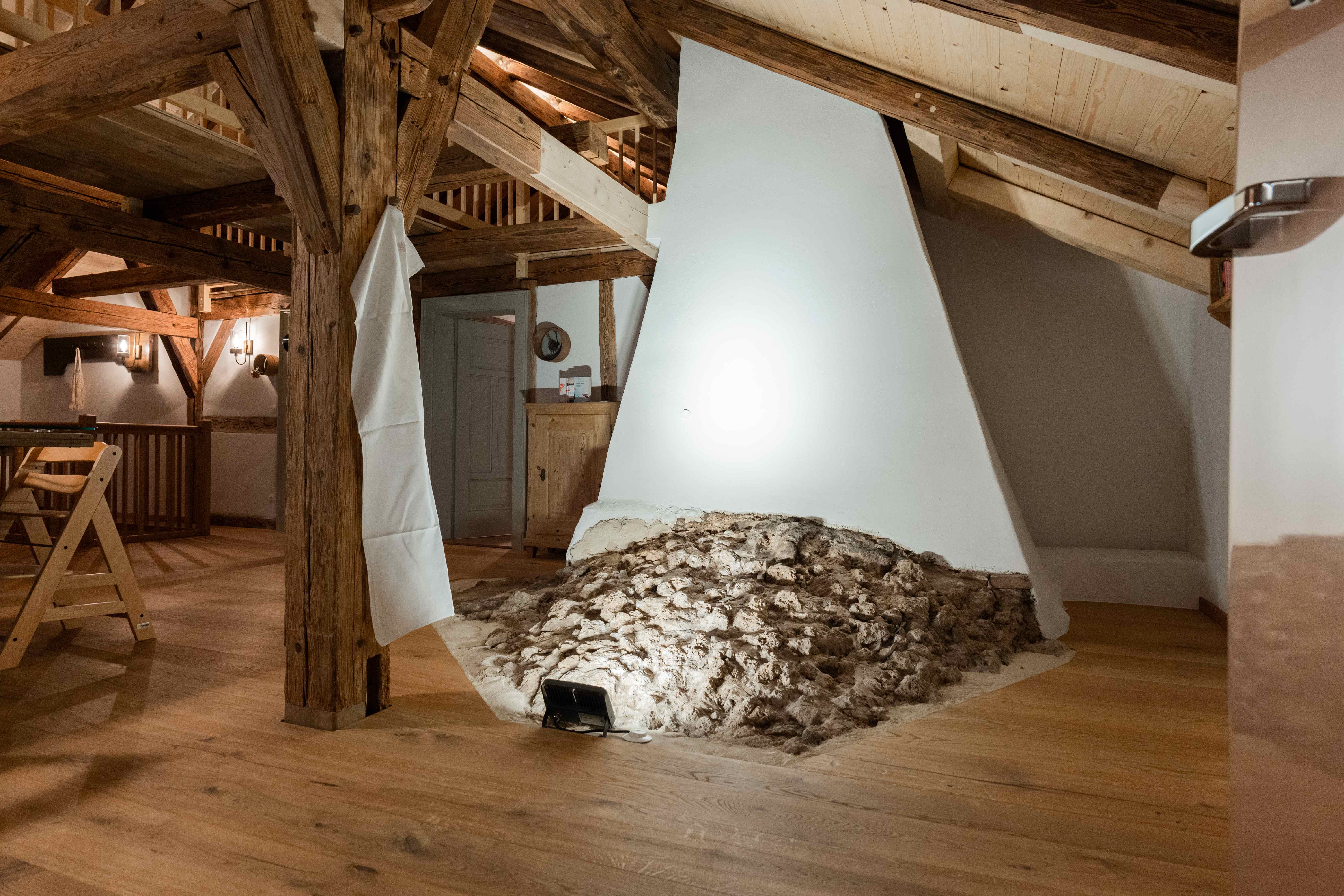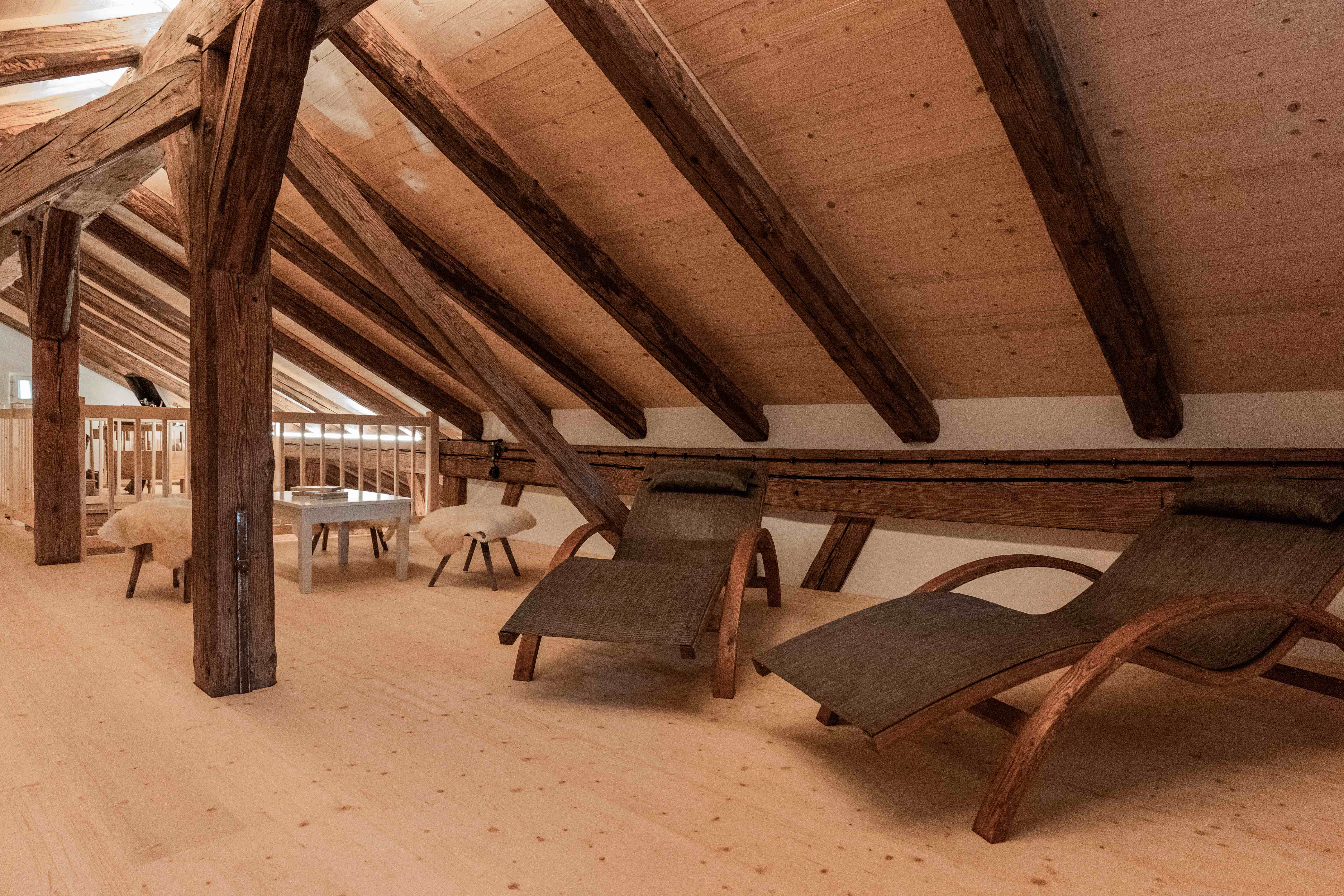 Unter dem alten Dach ist eine einzigartige Ferienwohnung entstanden, die großzügig und trotz kleiner Fenster und fehlender Gauben durch die helle Gestaltung lichtdurchflutet und einladend wirkt. Unter der neuen Holzschalung erstreckt sich eine großzügige Galerie, die einen interessanten Kontrast zu den vorspringenden Dachsparren aus der Erbauungszeit bildet.