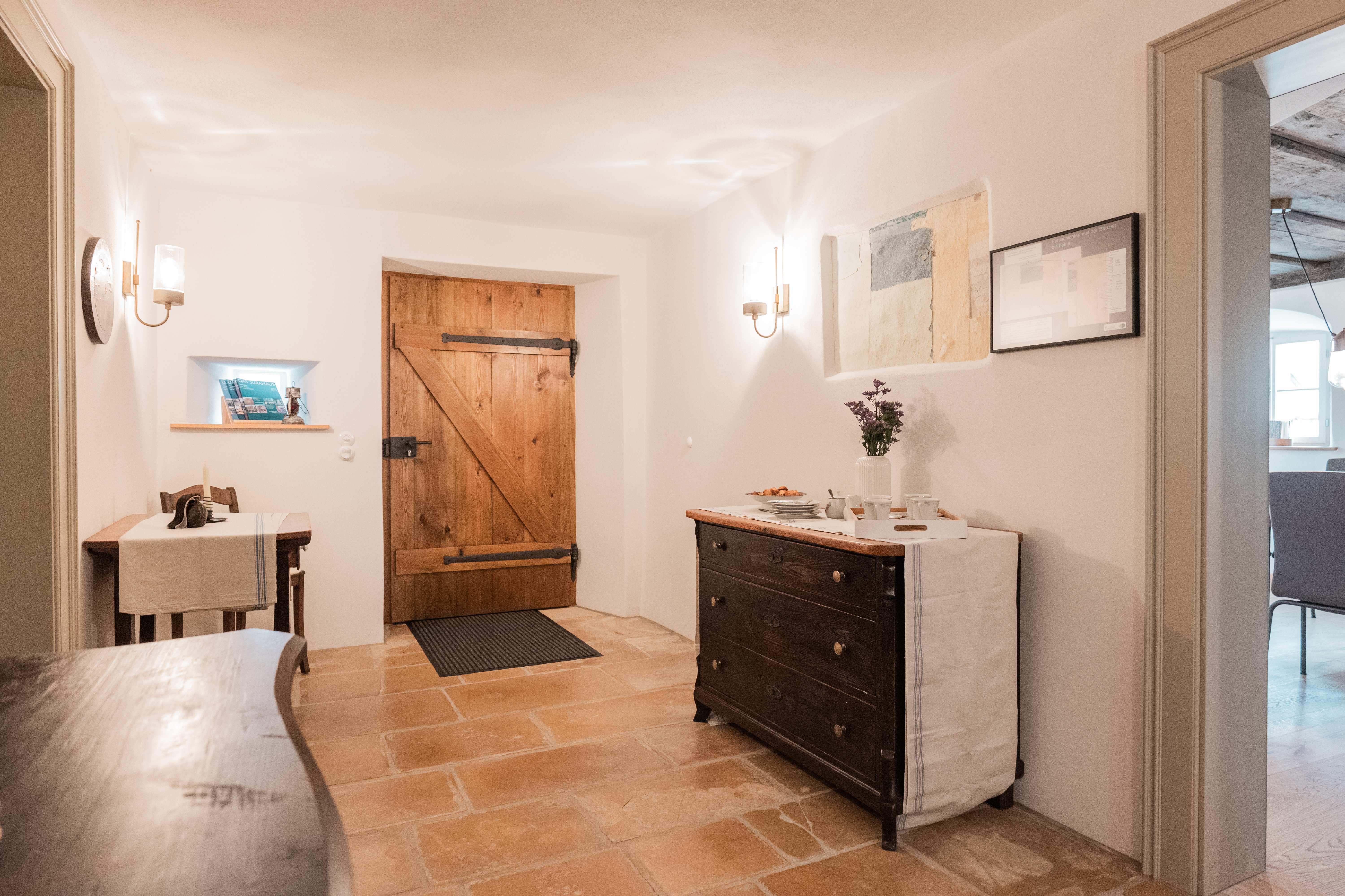 Betritt man das Haus durch die hölzerne Eingangstür, offenbart sich der für Jurahäuser typische breite Flur, der mit original erhaltenen Solnhofener Platten ausgelegt ist. Von ihm gehen alle weiteren Räume ab.